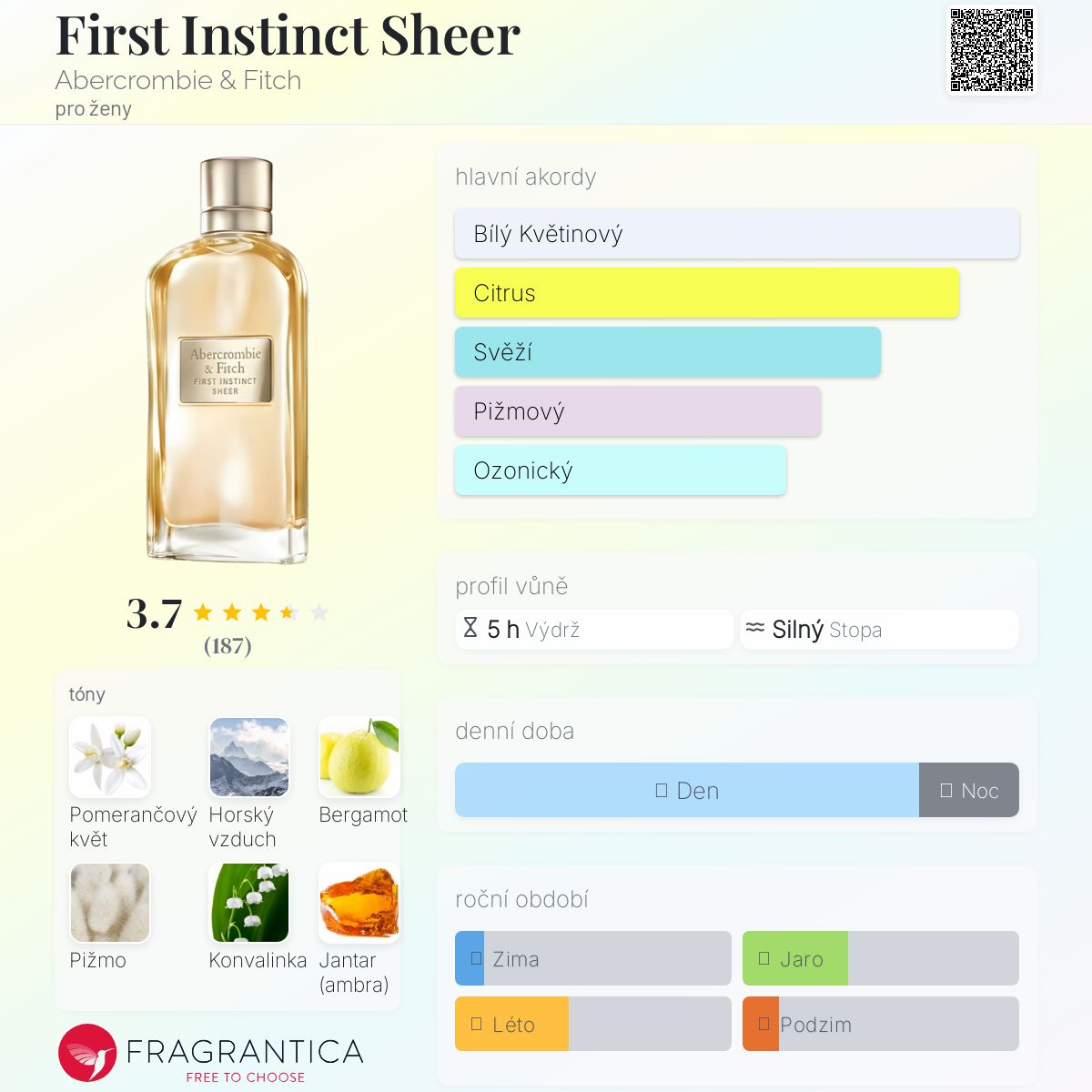 First Instinct Sheer podle Abercrombie & Fitch je Orientální Floral vůně pro ženy. First Instinct Sheer byl/a uveden/a v roce 2019. First Instinct Sheer byl/a vytvořen/a Jean-Marc Chaillan a Celine Barel. Vrchní tóny jsou Horský vzduch, Bergamot a Růžový pepř; střední tóny jsouPomerančový květ, Konvalinka a Ibišek ; základní tóny jsou Pižmo, Jantar (ambra) a Dřevité tóny.