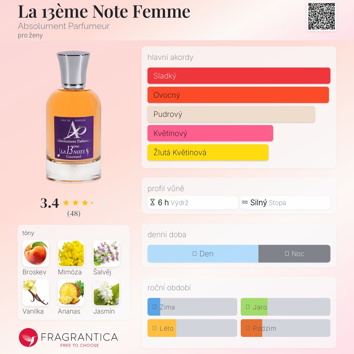 La 13ème Note Femme podle Absolument Parfumeur je Floral Fruity Gourmand vůně pro ženy. La 13ème Note Femme byl/a uveden/a v roce 2013. La 13ème Note Femme byl/a vytvořen/a Pascal Rolland a Marc Villaceque. Vrchní tóny jsou Šalvěj, Ananas, Maliny a Lesní jahoda; střední tóny jsouMimóza, Vanilka, Jasmín, Fialka a Růže ; základní tóny jsou Bílá broskev, Pižmo, Med a Jantar (ambra).