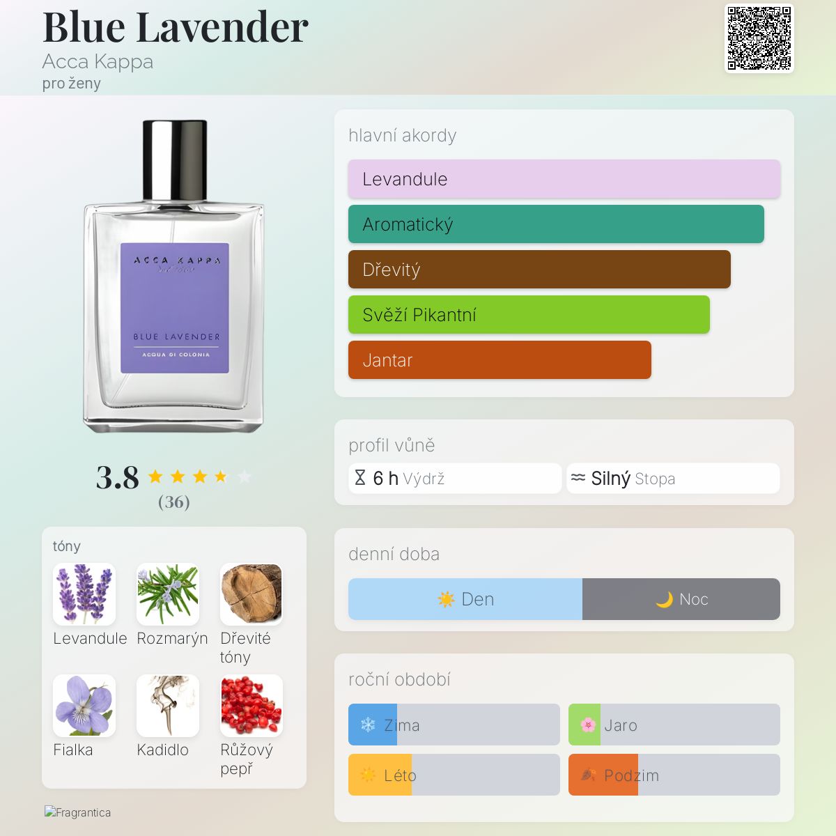 Blue Lavender podle Acca Kappa je Aromatic Fougere vůně pro ženy. Blue Lavender byl/a uveden/a v roce 2010. Vrchní tóny jsou Rozmarýn, Kadidlo a Růžový pepř; střední tóny jsouLevandule a Fialka ; základní tóny jsou Dřevité tóny, Bílé pižmo a Jantar (ambra).