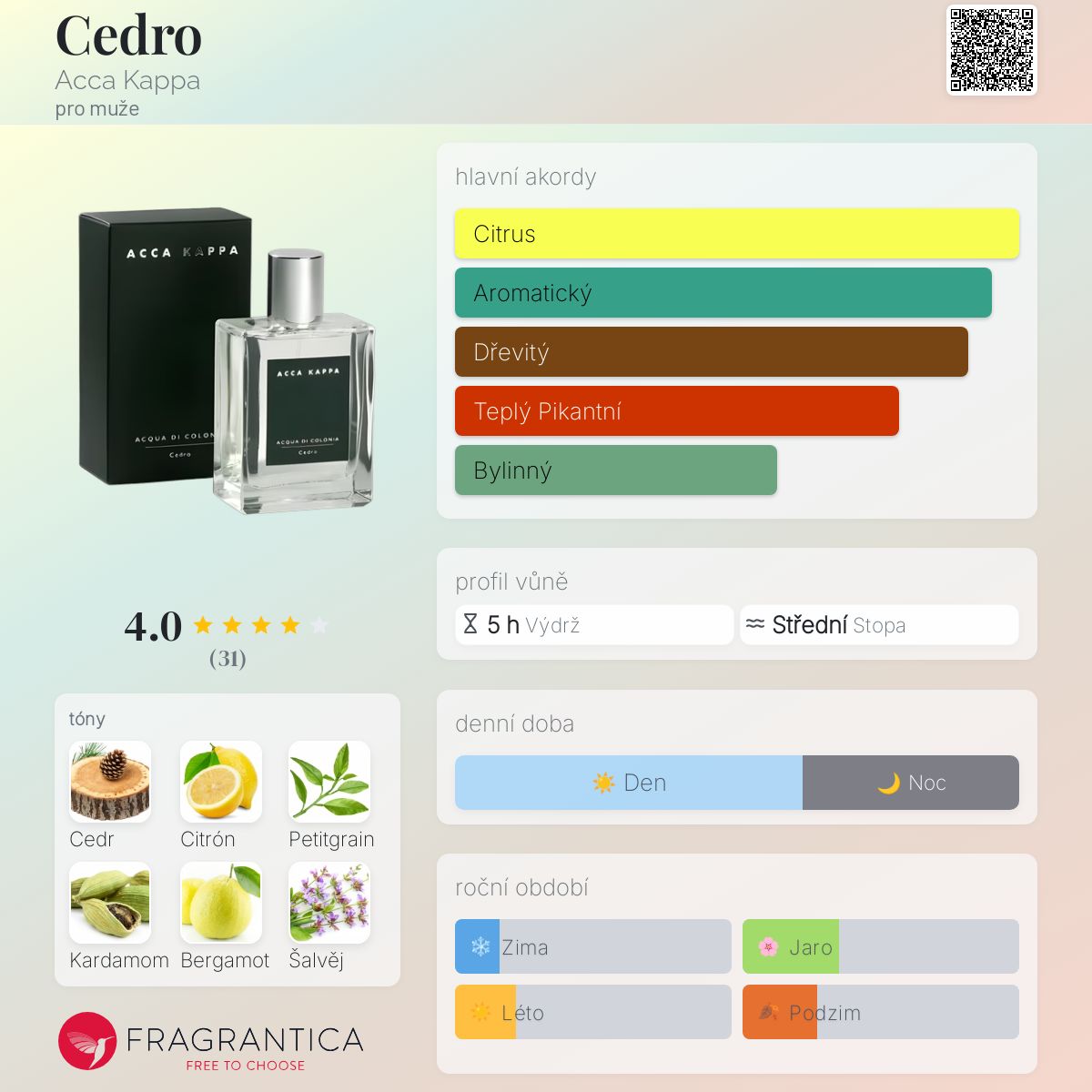 Cedro podle Acca Kappa je Woody Aromatic vůně pro muže. Cedro byl/a uveden/a v roce 1999. Vrchní tóny jsou Citrón, Petitgrain a Bergamot; střední tóny jsouKardamom, Šalvěj a Hřebíček ; základní tón je Cedr.