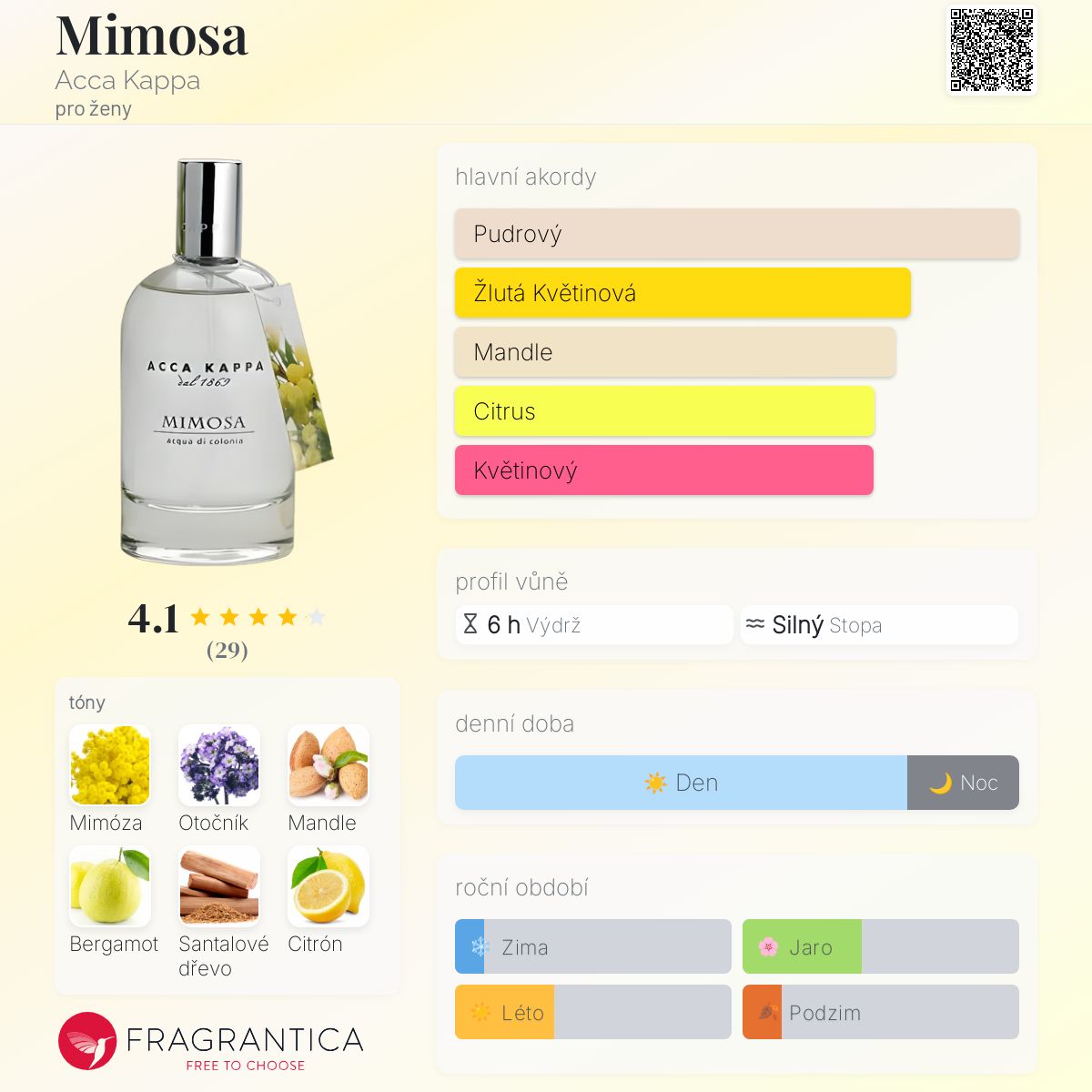 Mimosa podle Acca Kappa je Floral vůně pro ženy. Mimosa byl/a uveden/a v roce 2004.