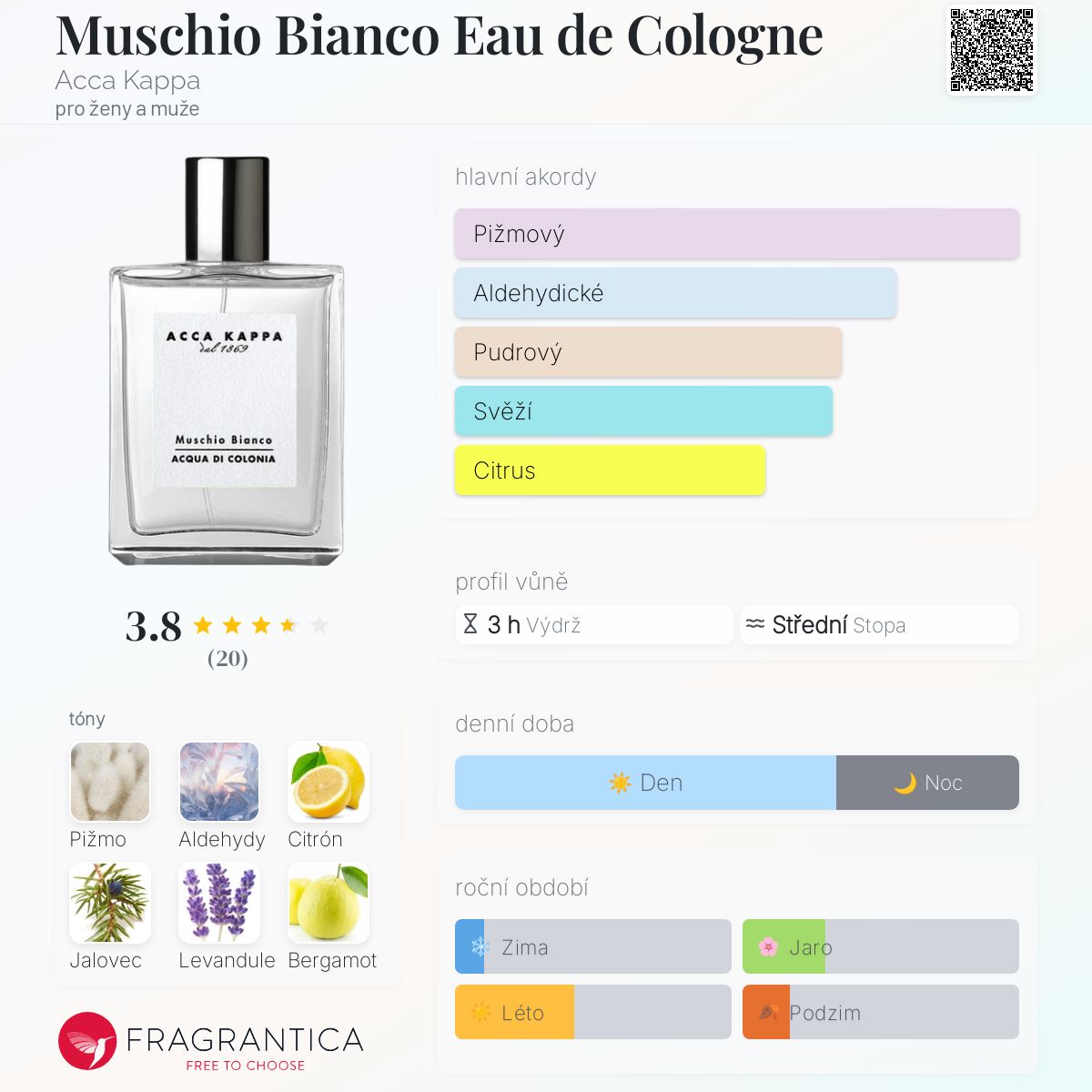 Muschio Bianco Eau de Cologne podle Acca Kappa je Floral Woody Musk vůně pro ženy a muže. Muschio Bianco Eau de Cologne byl/a uveden/a v roce 1997. Vrchní tóny jsou Citrón, Jalovec a Bergamot; střední tóny jsouAldehydy, Levandule a Kardamom ; základní tóny jsou Bílé pižmo, Jantar (ambra) a Cedr.