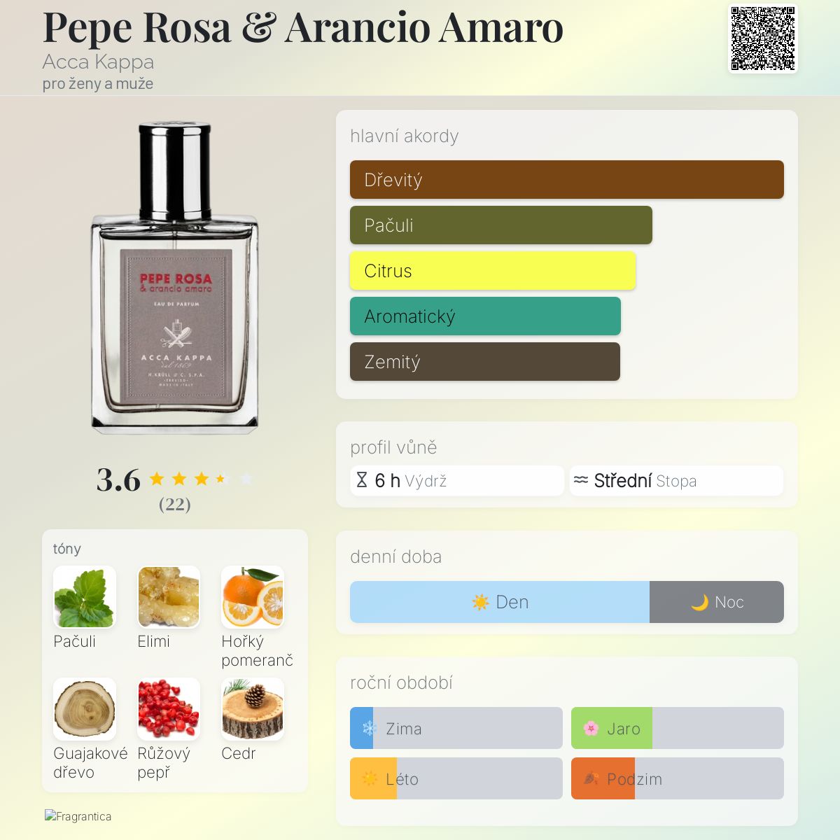 Pepe Rosa & Arancio Amaro podle Acca Kappa je Citrus Aromatic vůně pro ženy a muže. Pepe Rosa & Arancio Amaro byl/a uveden/a v roce 2023. Vrchní tóny jsou Hořký pomeranč, Růžový pepř, Bergamot a Citrón; střední tóny jsouPačuli, Elemi a Jasmín ; základní tóny jsou Guajakové dřevo, Cedr, Dubový mech a Jantar (ambra).