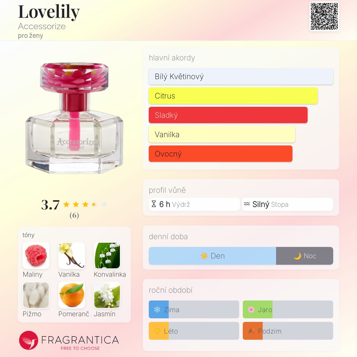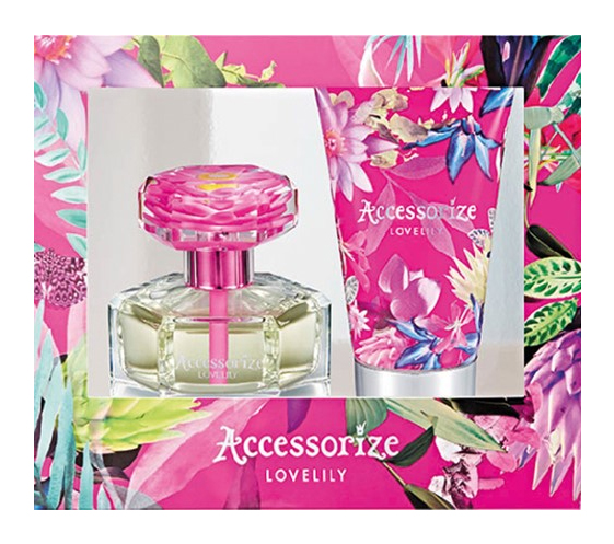 Lovelily podle Accessorize je Floral Fruity vůně pro ženy. Lovelily byl/a uveden/a v roce 2016. "Nosem" za touto vůní je Beverley Bayne. Vrchní tóny jsou Maliny, Pomeranč a Bergamot; střední tóny jsouKonvalinka a Jasmín ; základní tóny jsou Vanilka a Pižmo.