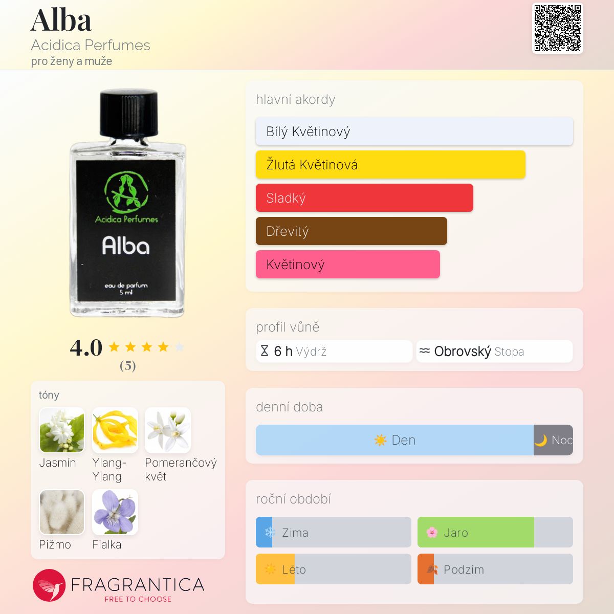 Alba podle Acidica Perfumes je vůně pro ženy a muže. Alba byl/a uveden/a v roce 2018. "Nosem" za touto vůní je Elena Markova.