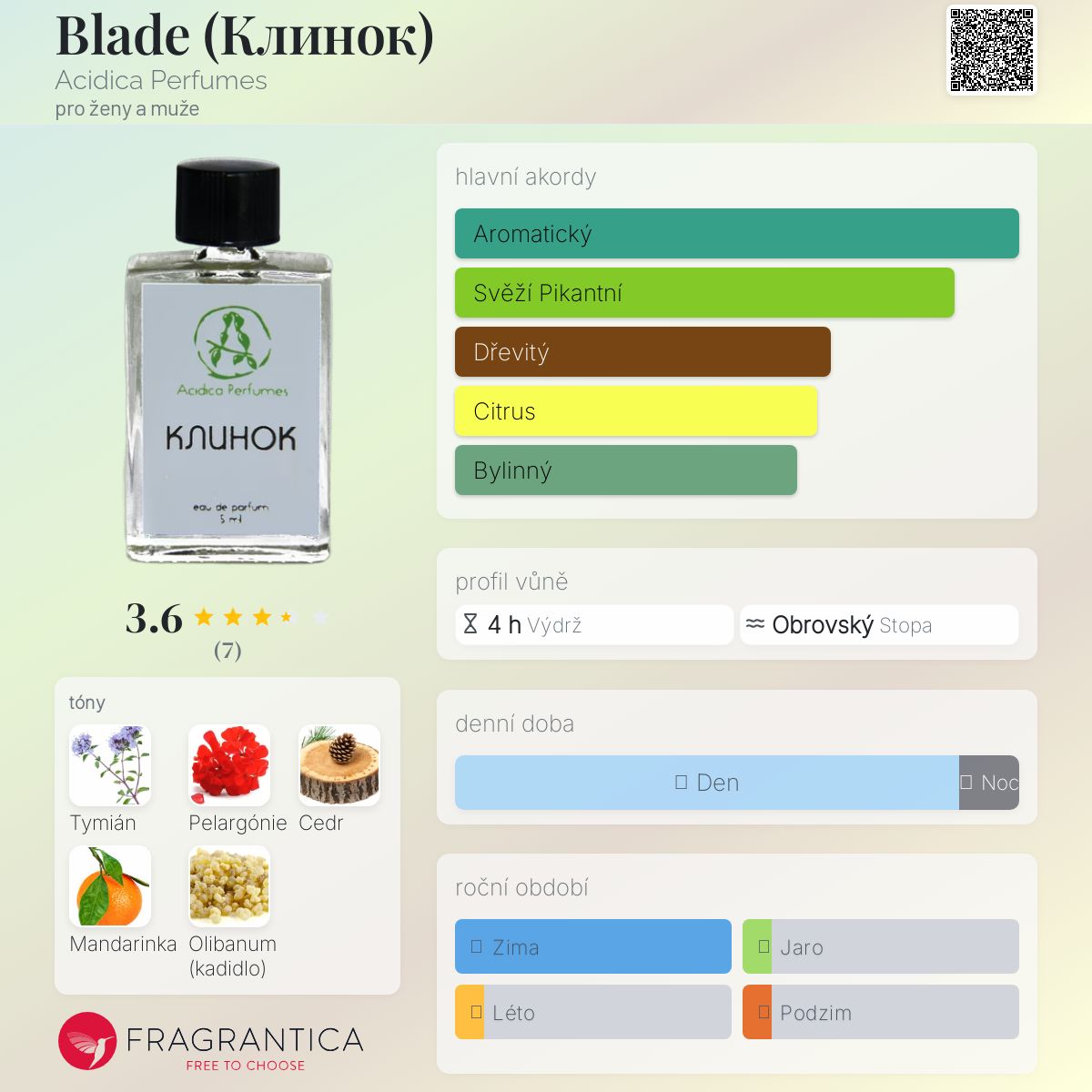 Blade (Клинок) podle Acidica Perfumes je Citrus vůně pro ženy a muže. Blade (Клинок) byl/a uveden/a v roce 2018. "Nosem" za touto vůní je Elena Markova.