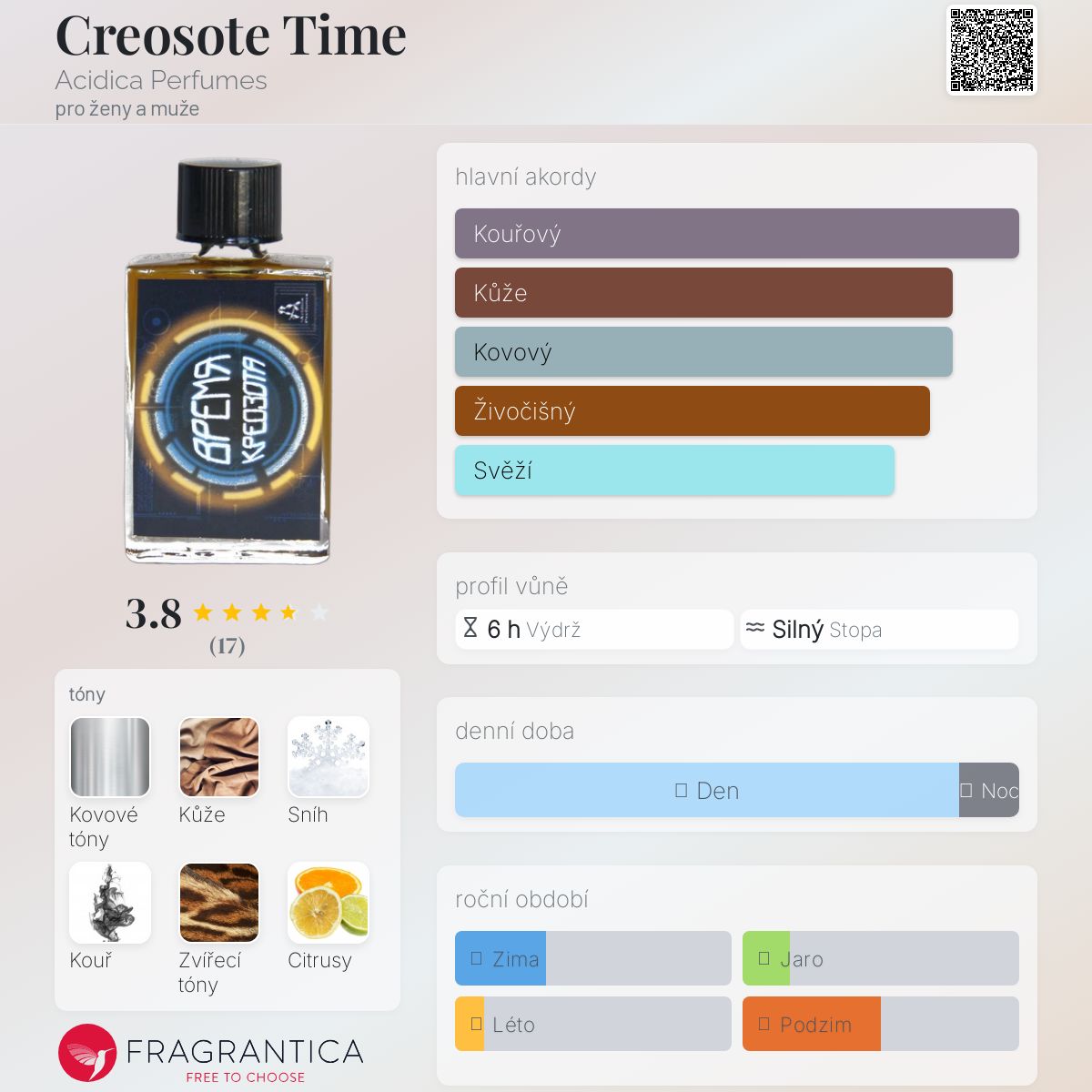 Creosote Time podle Acidica Perfumes je vůně pro ženy a muže. Creosote Time byl/a uveden/a v roce 2016. "Nosem" za touto vůní je Elena Markova.