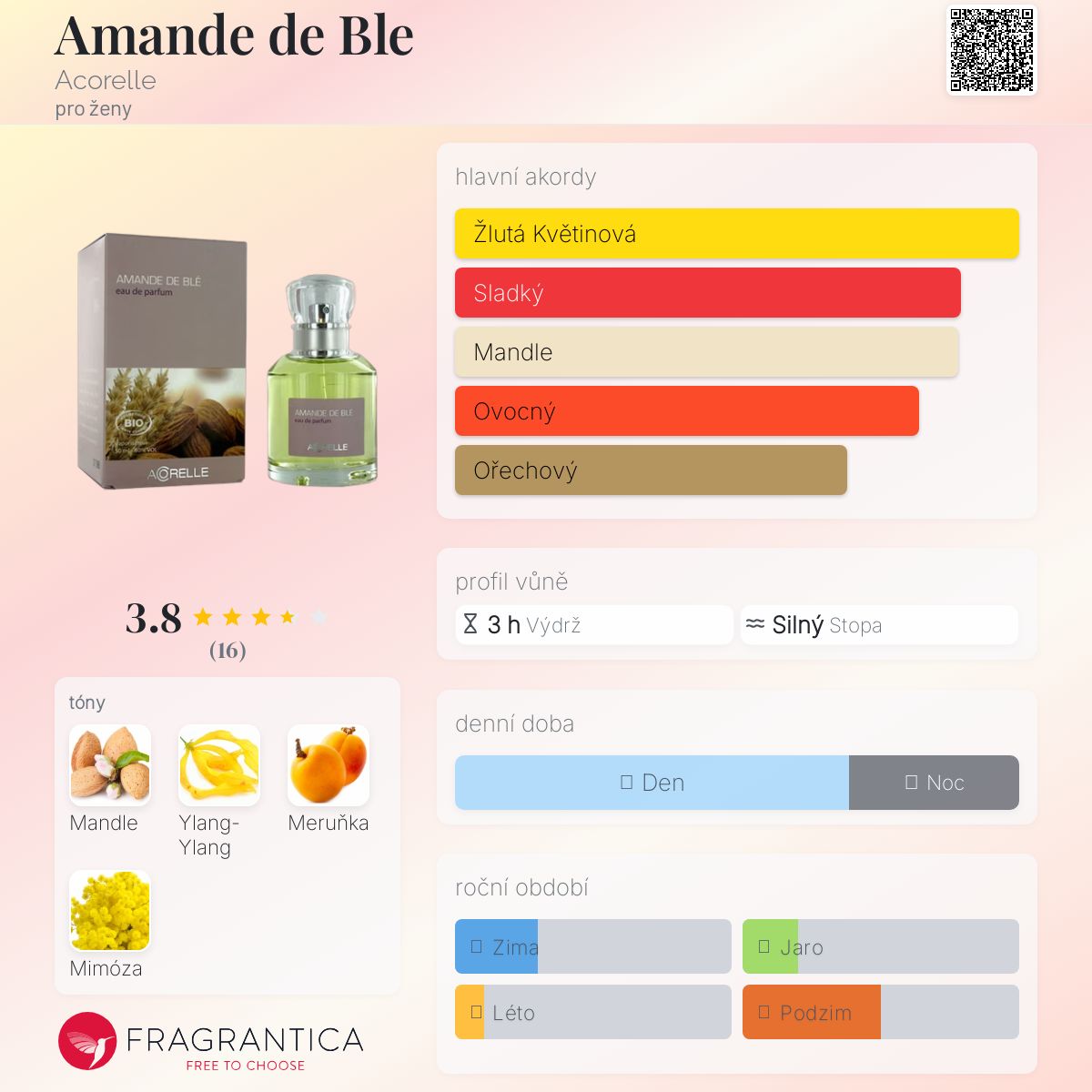 Amande de Ble podle Acorelle je Floral Fruity vůně pro ženy. Vrchní tón je Mandle ; střední tón jeYlang-Ylang ; základní tóny jsou Meruňka a Mimóza.