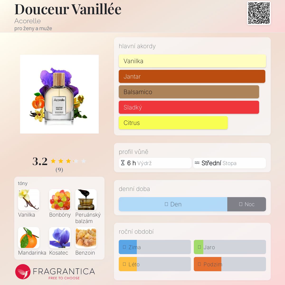 Douceur Vanillée podle Acorelle je Floral Fruity vůně pro ženy a muže. Vrchní tóny jsou Sladké tóny, Mandarinka a Bergamot; střední tóny jsouVanilkový květ, Kosatec a Ylang-Ylang ; základní tóny jsou Vanilka, Peruánský balzám a Benzoin.