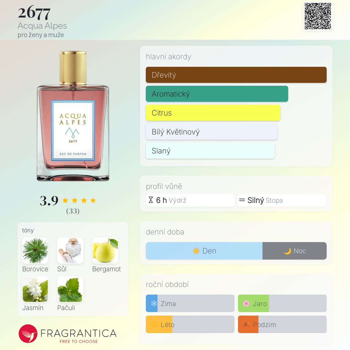 2677 podle Acqua Alpes je Woody Aromatic vůně pro ženy a muže. 2677 byl/a uveden/a v roce 2017. Vrchní tón je Bergamot ; střední tón jeJasmín ; základní tóny jsou Borovice, Sůl a Pačuli.