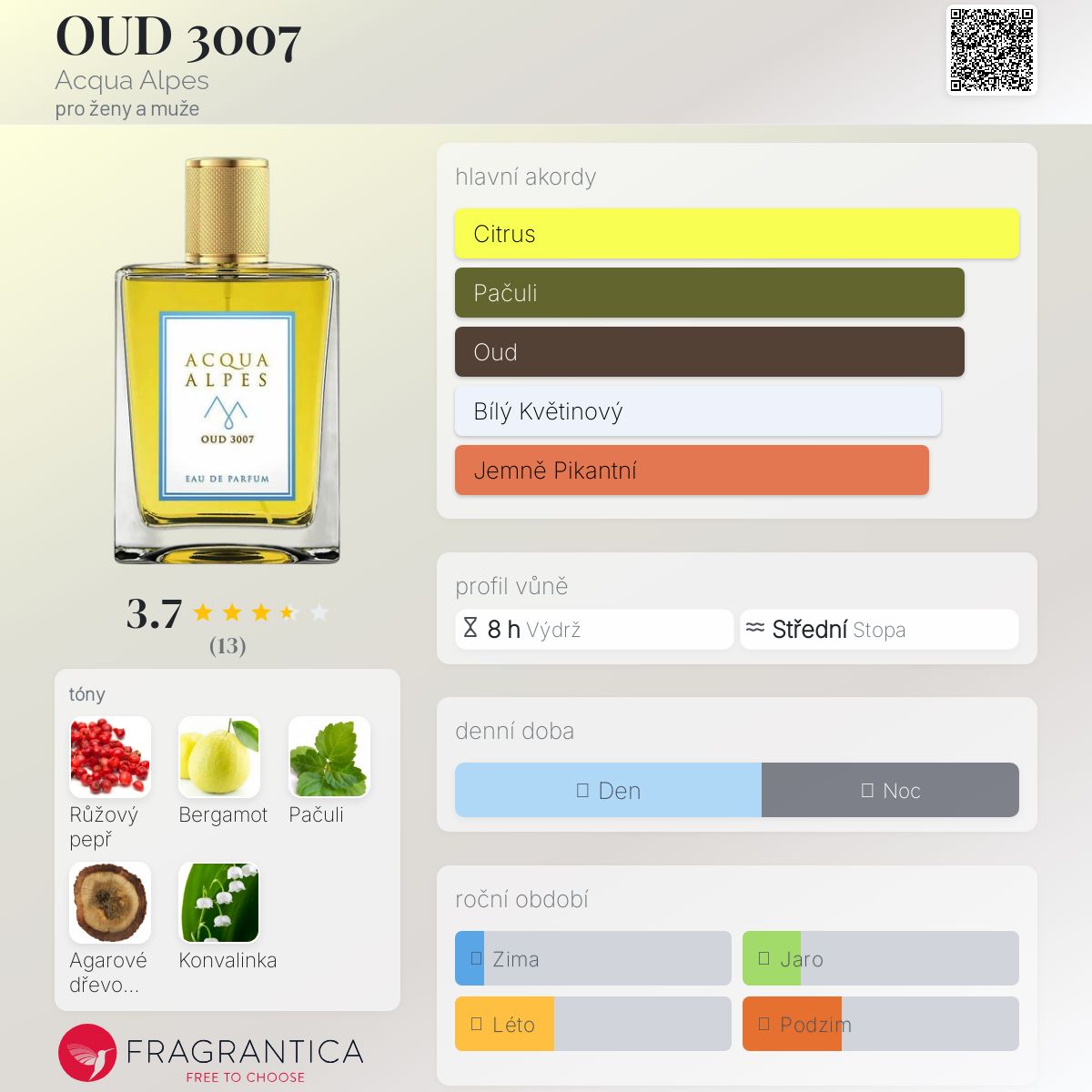 OUD 3007 podle Acqua Alpes je Woody Spicy vůně pro ženy a muže. OUD 3007 byl/a uveden/a v roce 2015. Vrchní tóny jsou Růžový pepř a Bergamot; střední tón jeKonvalinka ; základní tóny jsou Pačuli a Agarové dřevo (oud).