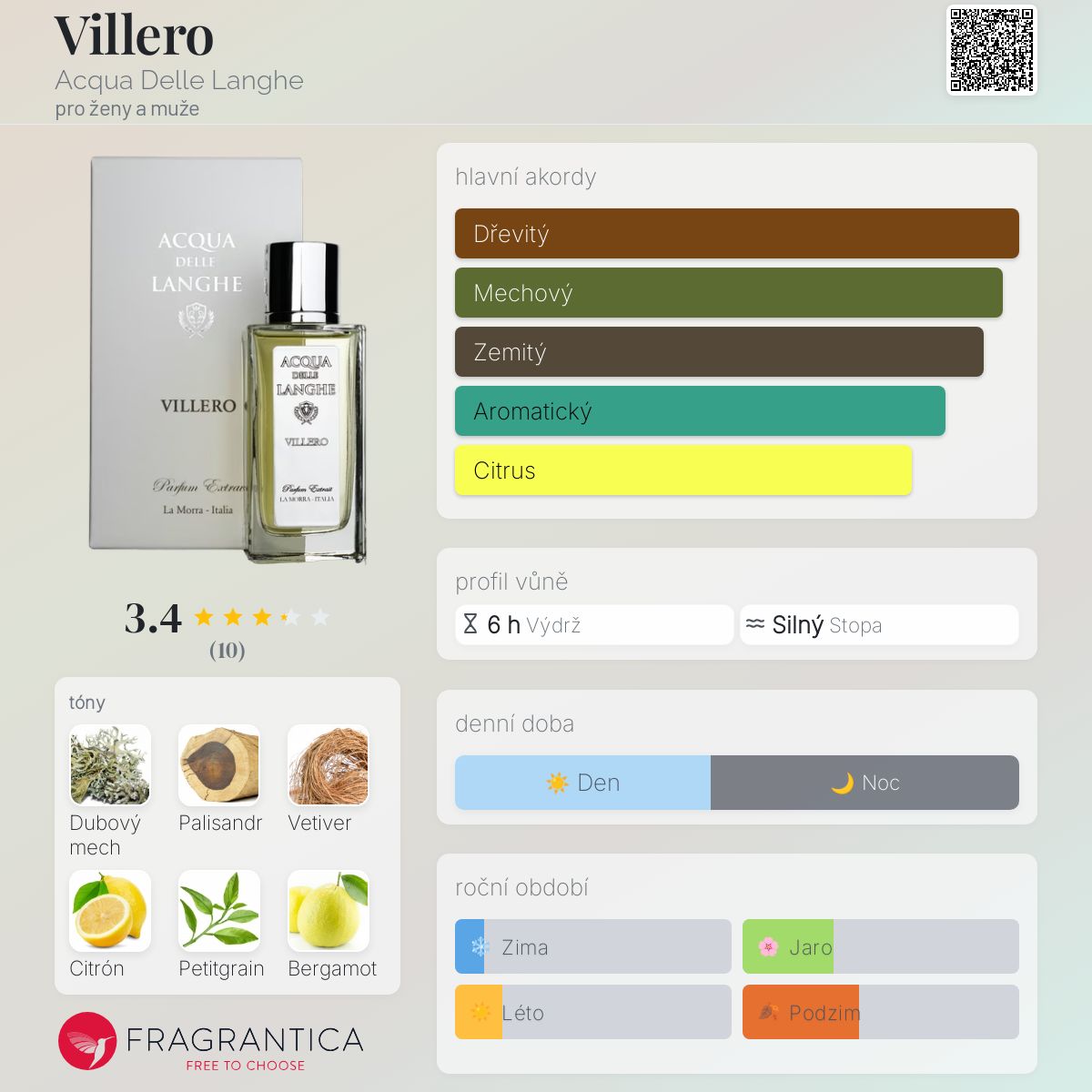 Villero podle Acqua Delle Langhe je Citrus Aromatic vůně pro ženy a muže. Villero byl/a uveden/a v roce 2012. Vrchní tóny jsou Citrón, Petitgrain, Bergamot, Kardamom, Pomeranč a Levandule; střední tóny jsouKonvalinka, Růže, Rozmarýn a Jasmín ; základní tóny jsou Mech, Palisandr, Vetiver, Pižmo a Grapefruit.