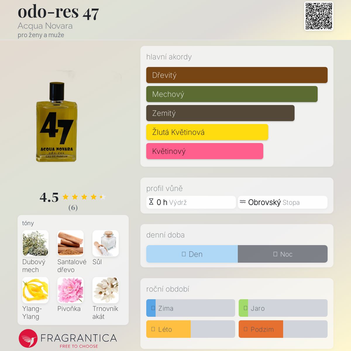 odo-res 47 podle Acqua Novara je vůně pro ženy a muže. odo-res 47 byl/a uveden/a v roce 2010. Vrchní tóny jsou Santalové dřevo, Sůl, Pivoňka a Písek; střední tóny jsouDubový mech, Trnovník akát a Badyán ; základní tóny jsou Ylang-Ylang a Pačuli.