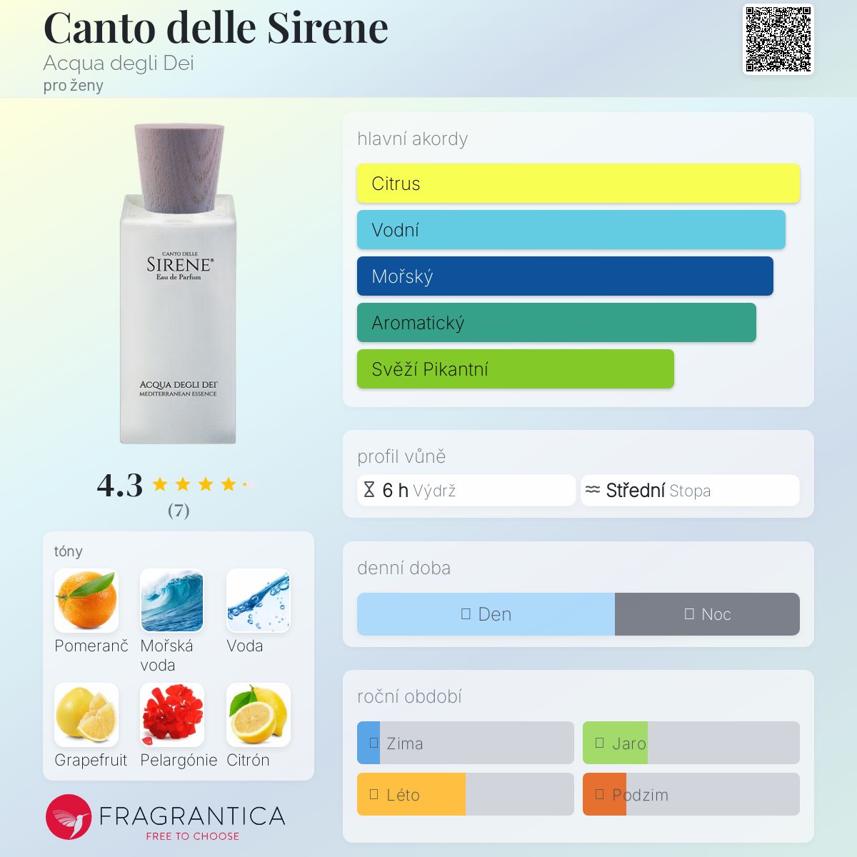 Canto delle Sirene podle Acqua degli Dei je vůně pro ženy. Canto delle Sirene byl/a uveden/a v roce 2020. Vrchní tóny jsou Pomeranč, Grapefruit, Pelargónie, Citrón, Řasy, Sůl a Máta; střední tóny jsouVodní tóny, Grapefruitová kůra, Ovocné tóny, Bílé pižmo, Gardénie, Magnólie, Jasmín, Růže a Kosatec ; základní tóny jsou Vodnaté tóny, Vzácné dřevo a Jantar (ambra).