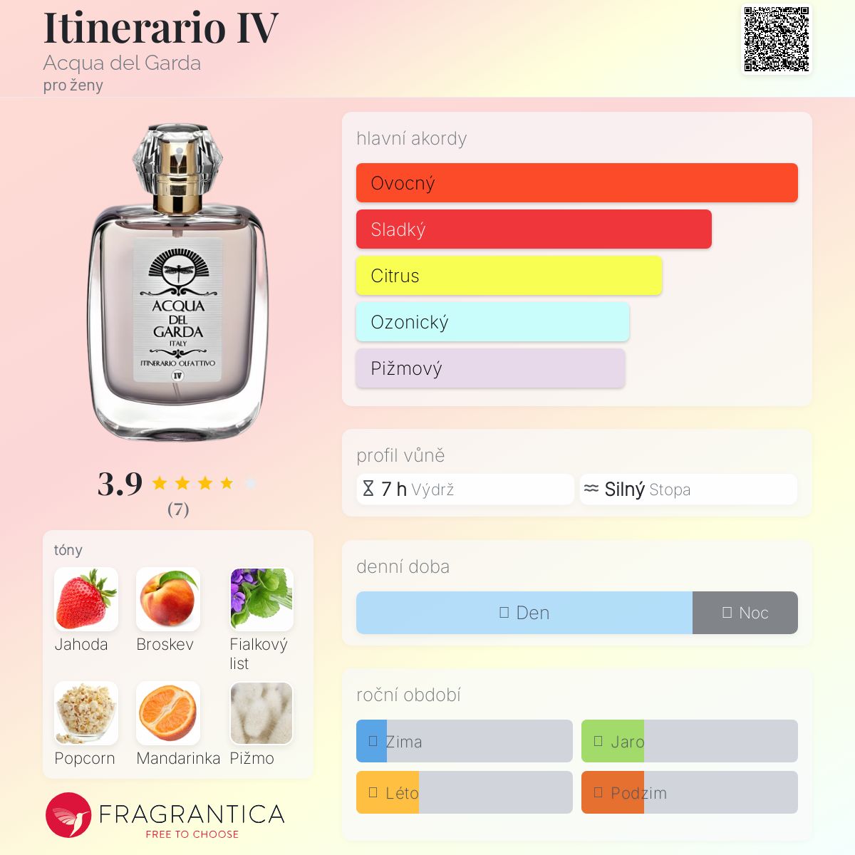 Itinerario IV podle Acqua del Garda je Floral vůně pro ženy. Itinerario IV byl/a uveden/a v roce 2015. Vrchní tóny jsou Jahoda, Fialkový list a Mandarinka; střední tóny jsouBroskev, Popcorn a Neroli ; základní tóny jsou Bílá broskev, Pižmo a Pačuli.