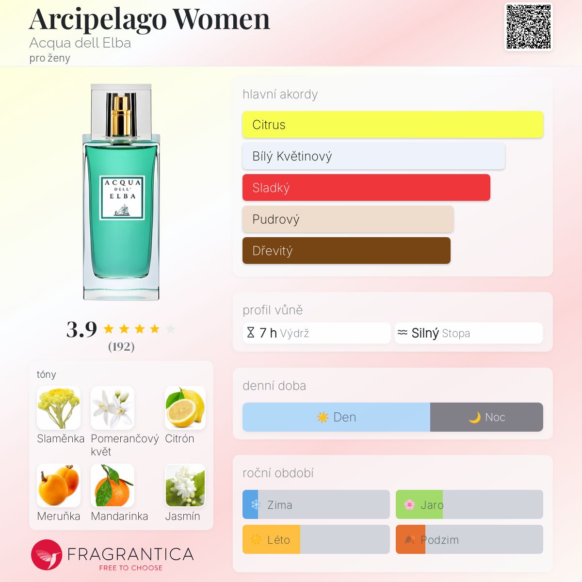 Arcipelago Women podle Acqua dell Elba je Floral Woody Musk vůně pro ženy. Vrchní tóny jsou Citrón, Meruňka a Mandarinka; střední tóny jsouSlaměnka, Pomerančový květ, Jasmín a Mimóza ; základní tóny jsou Dřevité tóny, Pižmo a Cedr.