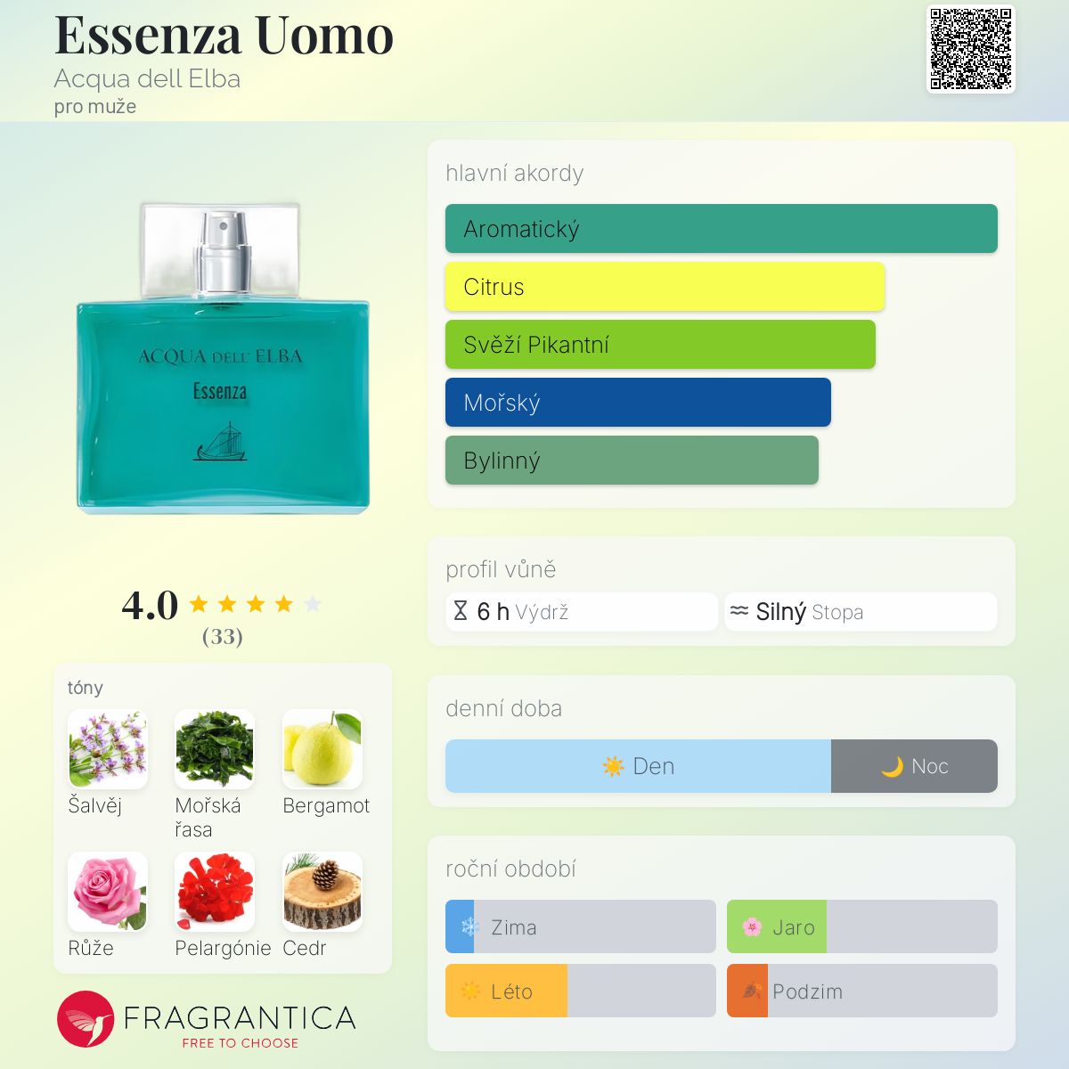 Essenza Uomo podle Acqua dell Elba je Woody Aquatic vůně pro muže. Essenza Uomo byl/a uveden/a v roce 2021. Vrchní tóny jsou Šalvěj, Bergamot, Cist, Citrón a Grapefruit; střední tóny jsouPelargónie, Fialka, Pepř a Jasmín ; základní tóny jsou Mořská řasa, Cedr, Dub, Medvědice a Masticha.