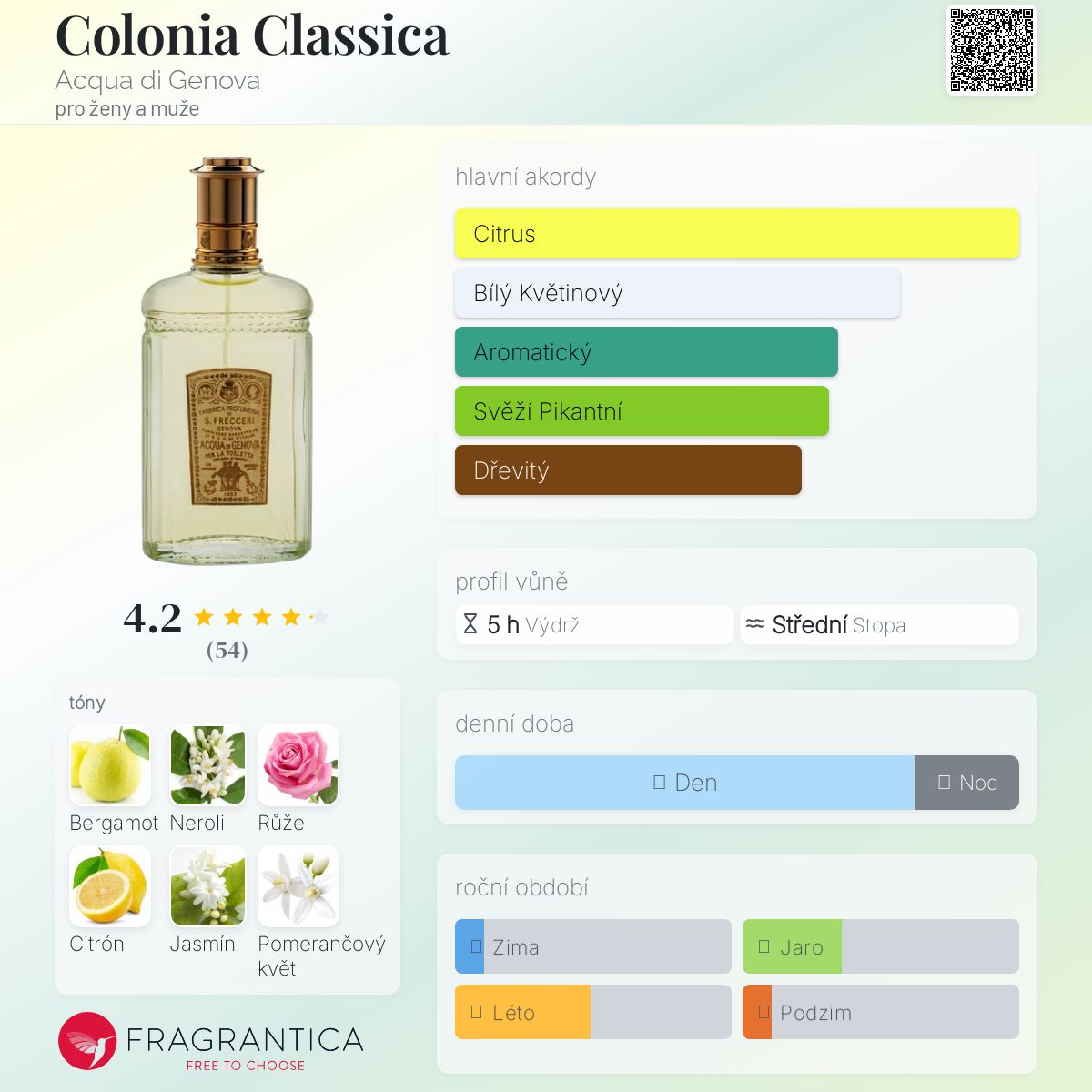 Colonia Classica podle Acqua di Genova je Citrus Aromatic vůně pro ženy a muže. Colonia Classica byl/a uveden/a v roce 1853. "Nosem" za touto vůní je Stefano Frecceri. Vrchní tóny jsou Bergamot, Neroli, Citron amalfi , Rozmarýn, Levandule a Pomeranč; střední tóny jsouRůže, Jasmín a Pomerančový květ ; základní tóny jsou Pižmo, Jantar (ambra), Pačuli a Santalové dřevo.