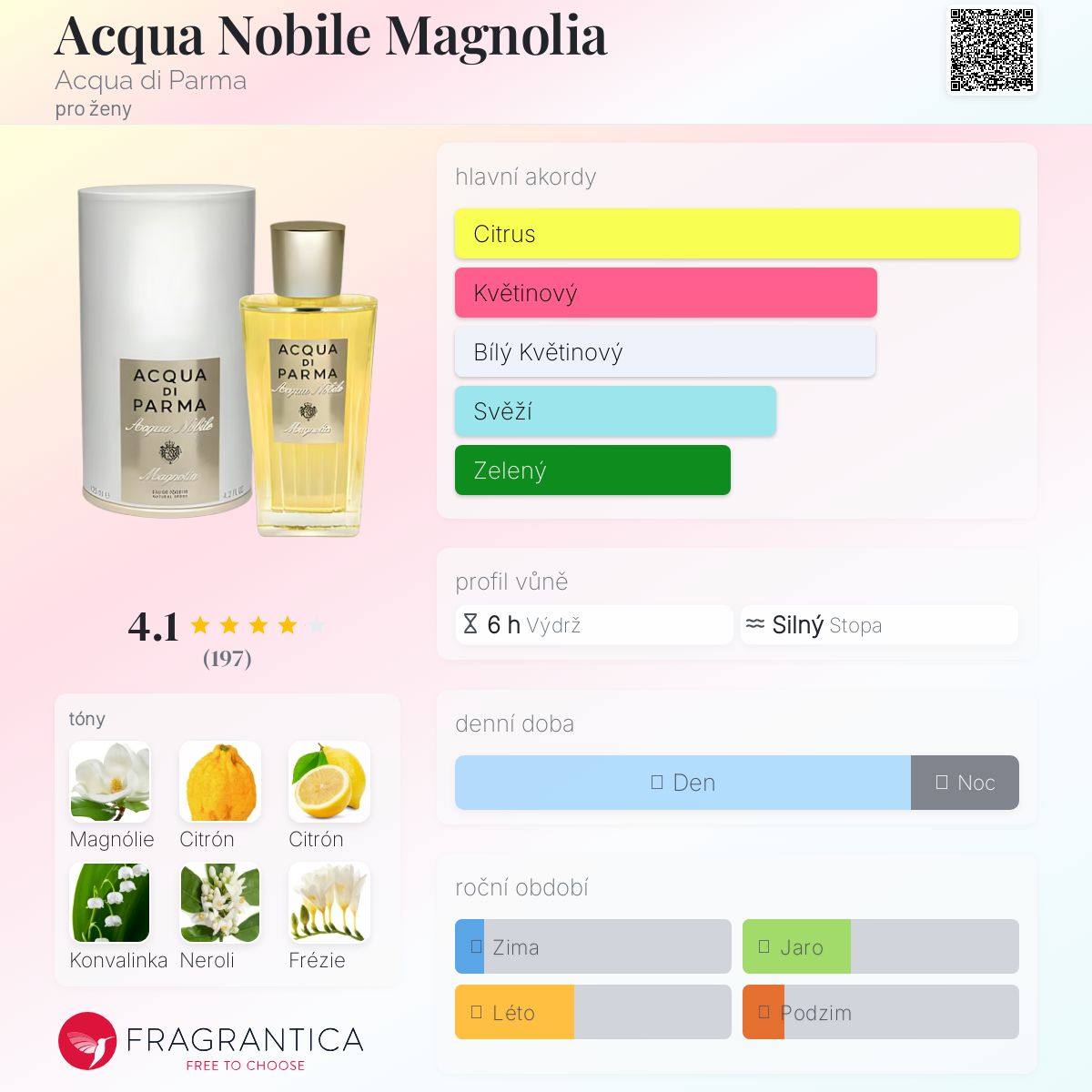 Acqua Nobile Magnolia podle Acqua di Parma je Floral vůně pro ženy. Acqua Nobile Magnolia byl/a uveden/a v roce 2013. Vrchní tóny jsou Citrón, Citrón, Neroli, Bergamot a Mandarinka; střední tóny jsouMagnólie, Konvalinka, Frézie, Jasmín a Pomerančový květ ; základní tóny jsou Vanilka a Pižmo.