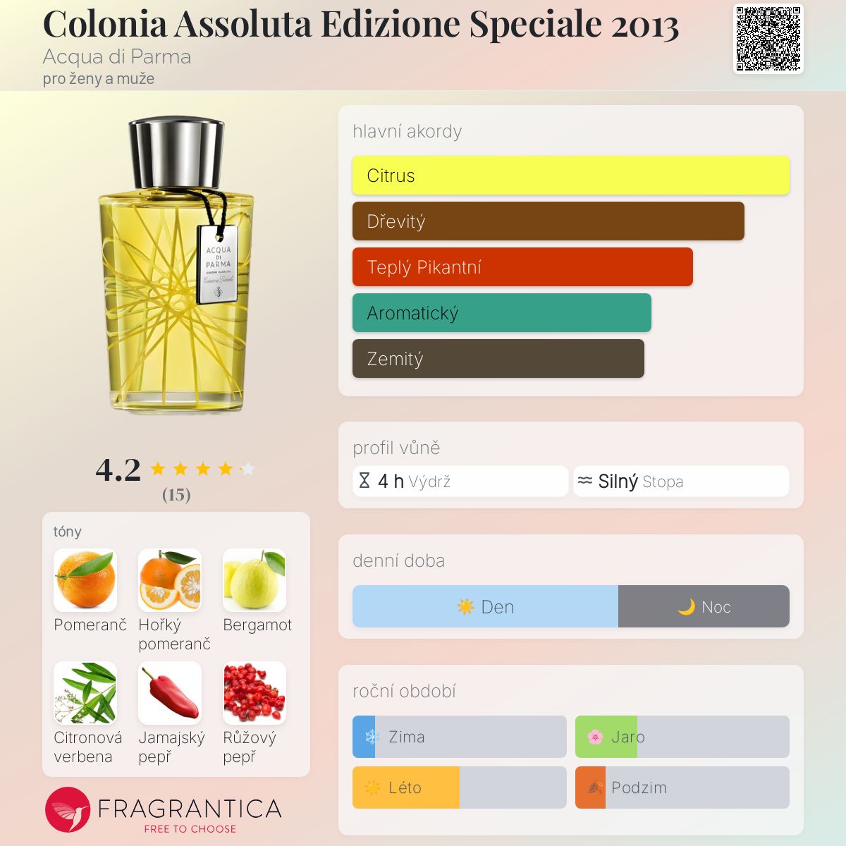 Colonia Assoluta Edizione Speciale 2013 podle Acqua di Parma je Citrus Aromatic vůně pro ženy a muže. Colonia Assoluta Edizione Speciale 2013 byl/a uveden/a v roce 2013. Colonia Assoluta Edizione Speciale 2013 byl/a vytvořen/a Jean-Claude Ellena a Bertrand Duchaufour. Vrchní tóny jsou Sladký pomeranč, Hořký pomeranč, Bergamot a Citronová verbena; střední tóny jsouJamajský pepř, Růžový pepř, Ylang-Ylang, Jasmín, Vetiver, Cedr a Kardamom ; základní tóny jsou Mech, Pižmo, Jantar (ambra) a Pačuli.