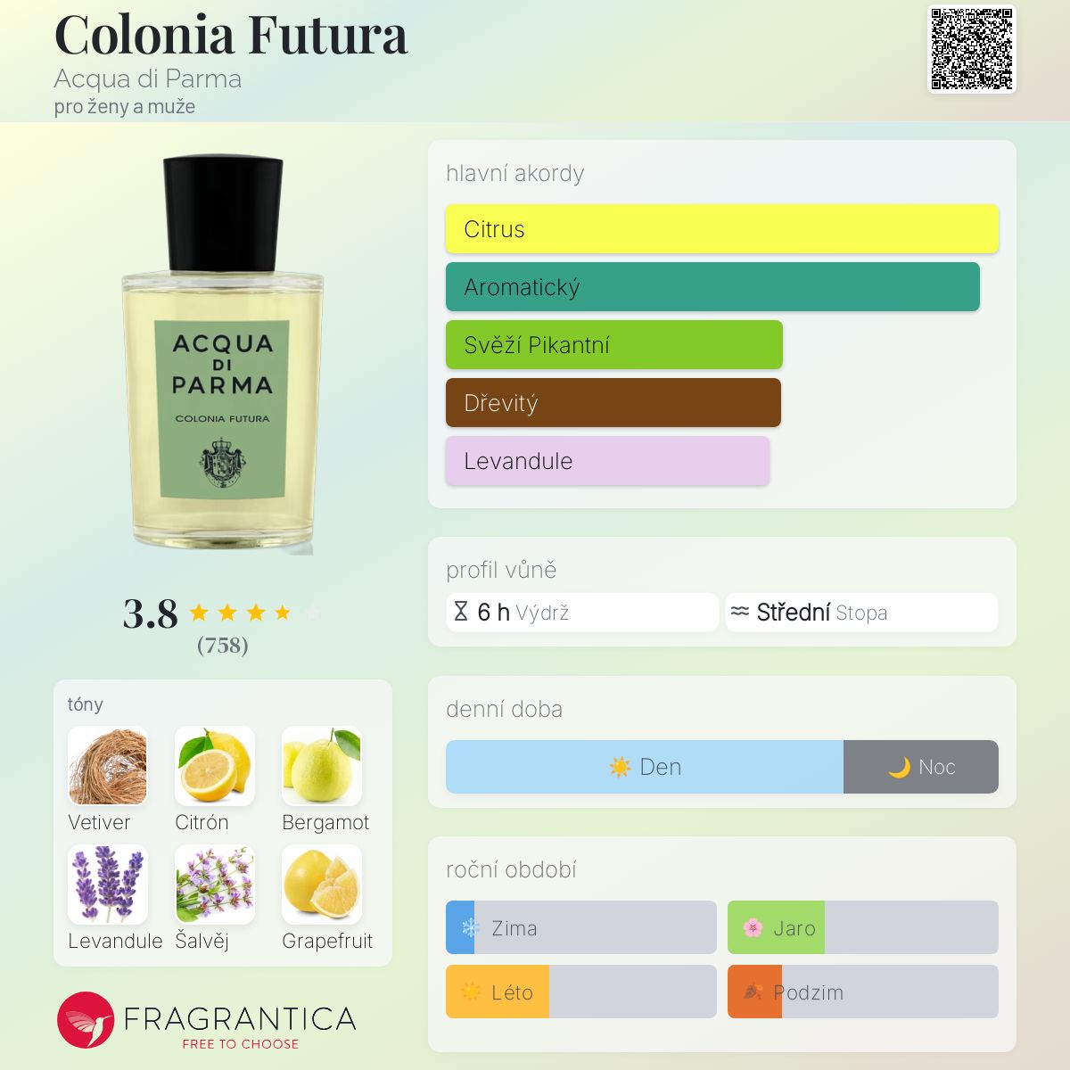 Colonia Futura podle Acqua di Parma je Citrus Aromatic vůně pro ženy a muže. Colonia Futura byl/a uveden/a v roce 2020. Vrchní tóny jsou Citrón, Bergamot, Grapefruit a Růžový pepř; střední tóny jsouLevandule a Šalvěj ; základní tón je Vetiver.