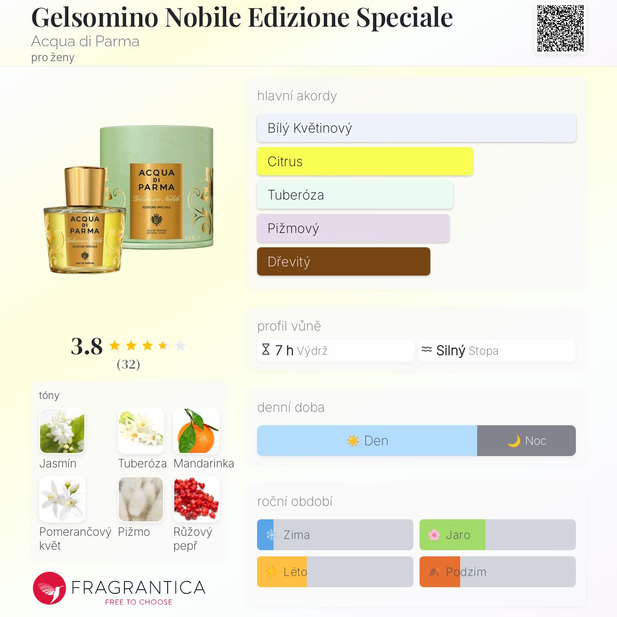 Gelsomino Nobile Edizione Speciale podle Acqua di Parma je Floral Woody Musk vůně pro ženy. Gelsomino Nobile Edizione Speciale byl/a uveden/a v roce 2014. Vrchní tóny jsou Mandarinka a Růžový pepř; střední tóny jsouJasmín, Tuberóza a Pomerančový květ ; základní tóny jsou Pižmo a Cedr.