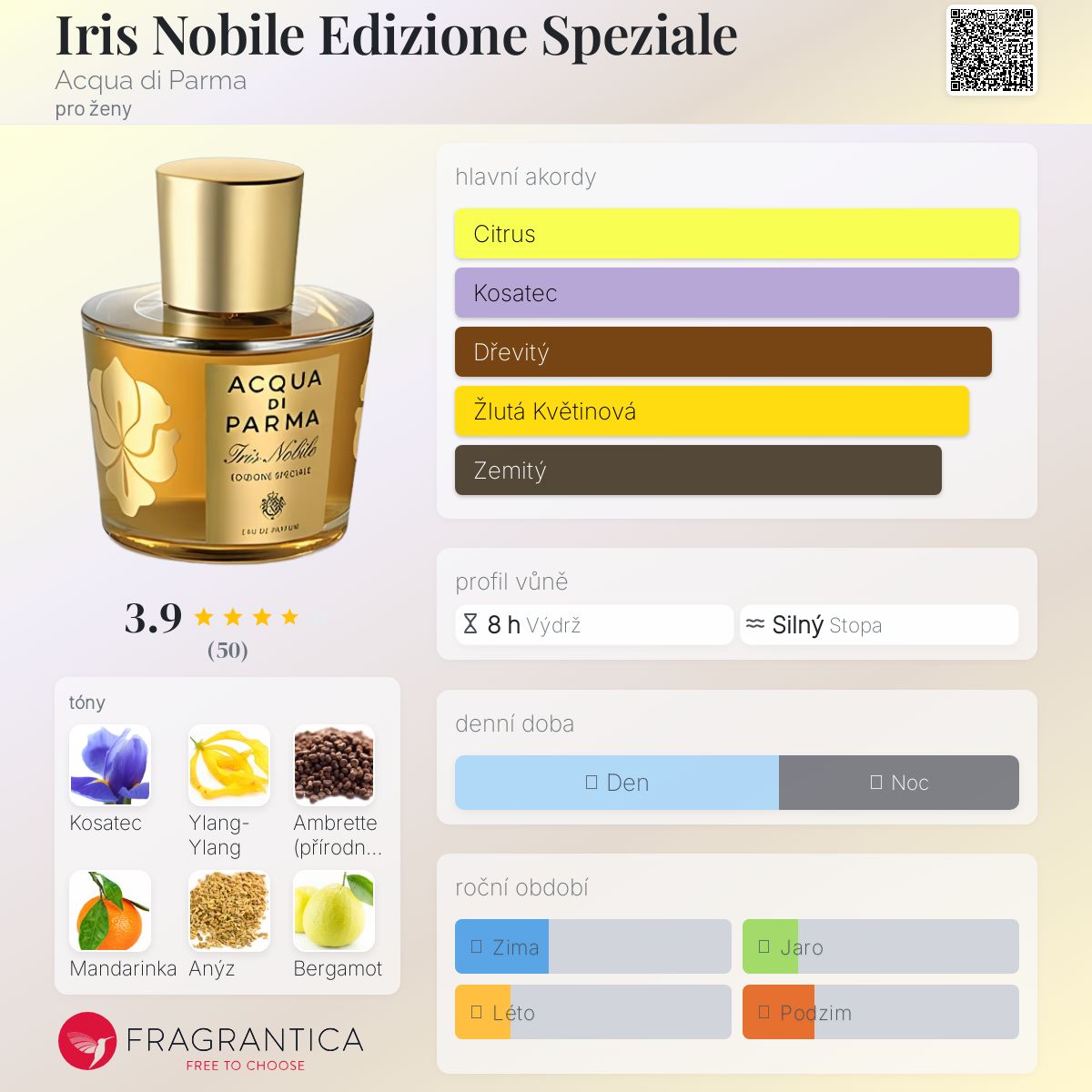 Iris Nobile Edizione Speziale podle Acqua di Parma je Chypre Floral vůně pro ženy. Iris Nobile Edizione Speziale byl/a uveden/a v roce 2010. Vrchní tóny jsou Mandarinka, Anýz a Bergamot; střední tóny jsouKosatec a Ylang-Ylang ; základní tóny jsou Ambrette (přírodní pižmo), Pačuli a Dubový mech.