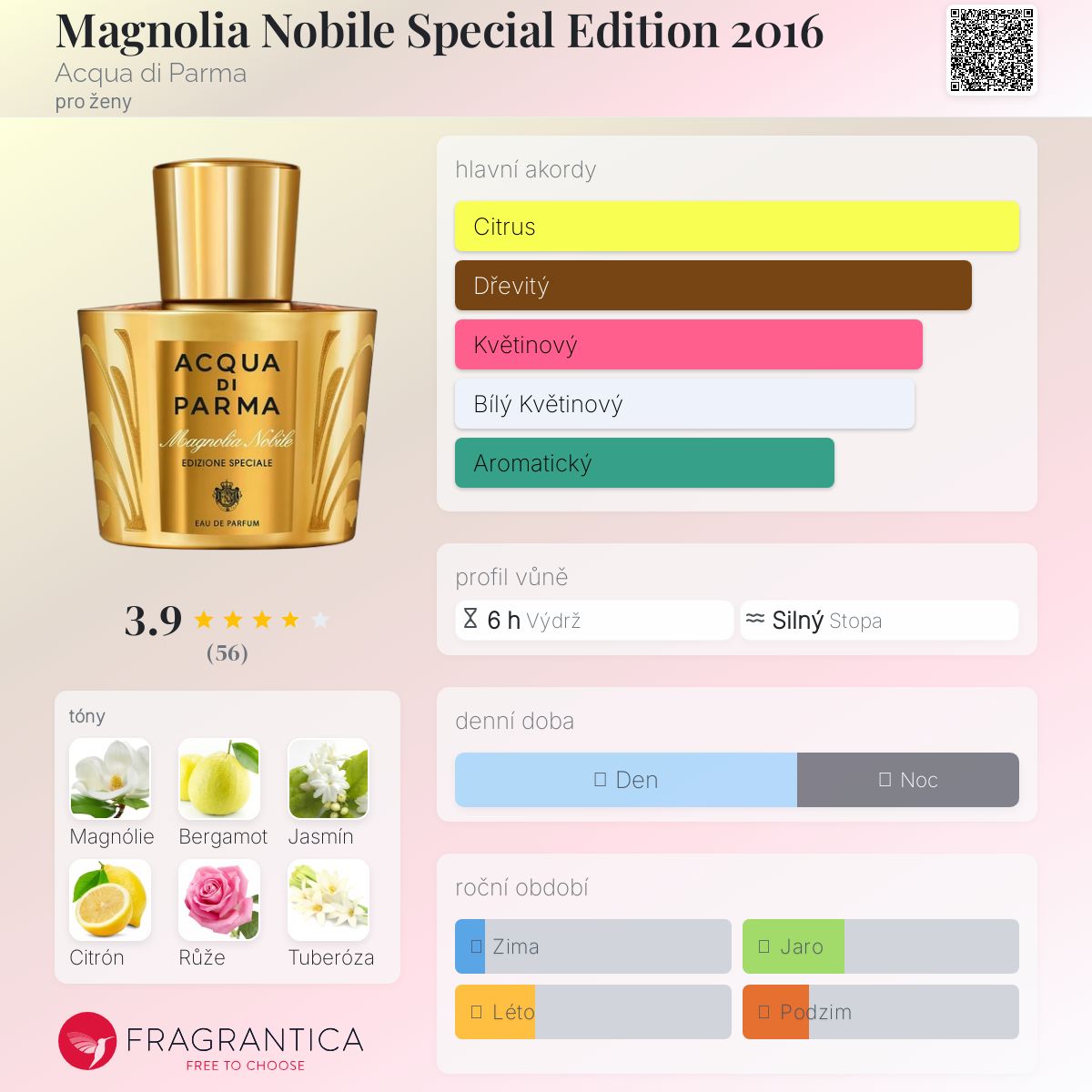 Magnolia Nobile Special Edition 2016 podle Acqua di Parma je Floral vůně pro ženy. Magnolia Nobile Special Edition 2016 byl/a uveden/a v roce 2016. Vrchní tóny jsou Bergamot, Citrón a Cedr; střední tóny jsouMagnólie, Jasmín, Růže a Tuberóza ; základní tóny jsou Santalové dřevo, Vanilka, Vetiver a Pačuli.