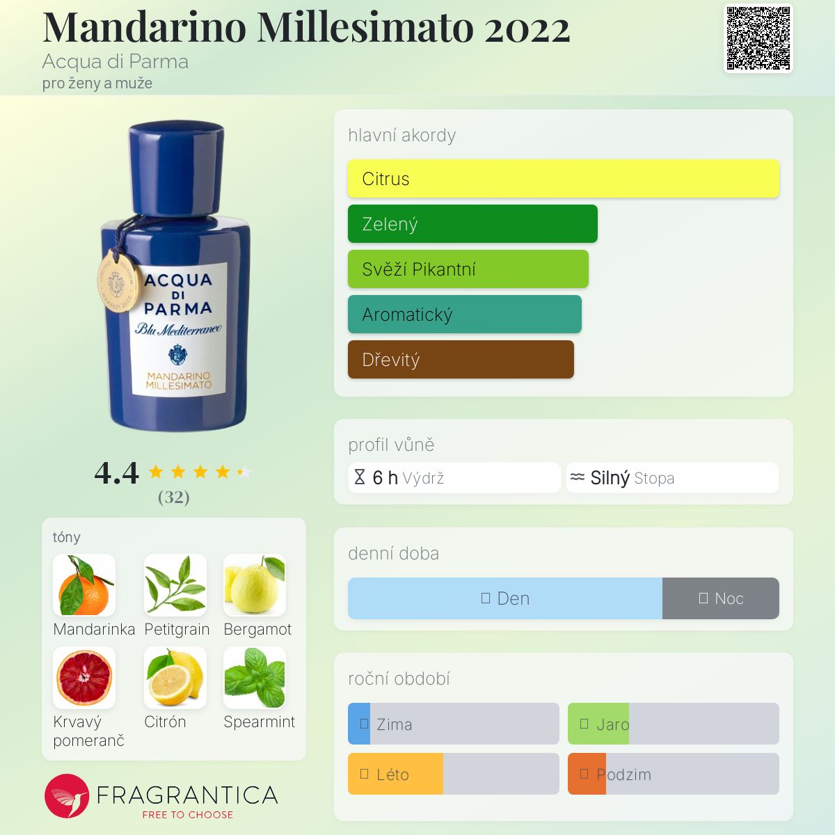 Mandarino Millesimato 2022 podle Acqua di Parma je Citrus Aromatic vůně pro ženy a muže. Toto je nová vůně. Mandarino Millesimato 2022 byl/a uveden/a v roce 2024. Vrchní tóny jsou Mandarinka, Bergamot, Krvavý pomeranč a Citrón; střední tóny jsouPetitgrain a Spearmint ; základní tóny jsou Cedr, Pižmo a Pačuli.
