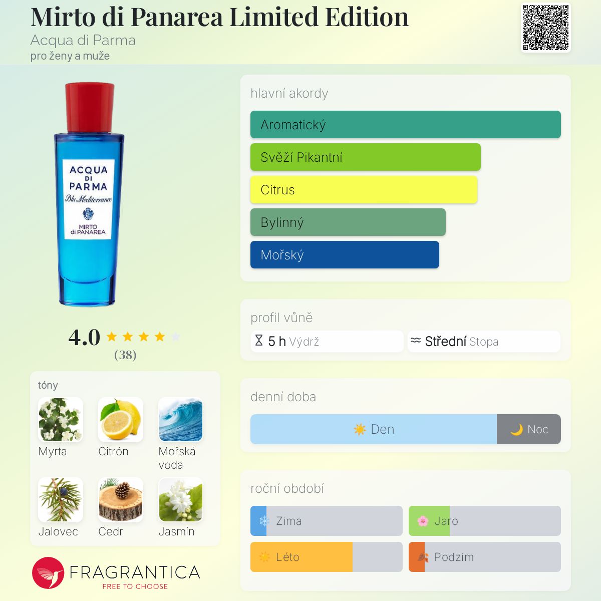 Mirto di Panarea Limited Edition podle Acqua di Parma je Aromatic Green vůně pro ženy a muže. Mirto di Panarea Limited Edition byl/a uveden/a v roce 2021. "Nosem" za touto vůní je François Demachy. Vrchní tóny jsou Myrta, Italský citrón, Bergamot a Bazalka; střední tóny jsouMořské tóny, Jasmín a Damašská růže ; základní tóny jsou Jalovec, Virginský cedr, Jantar (ambra) a Masticha.