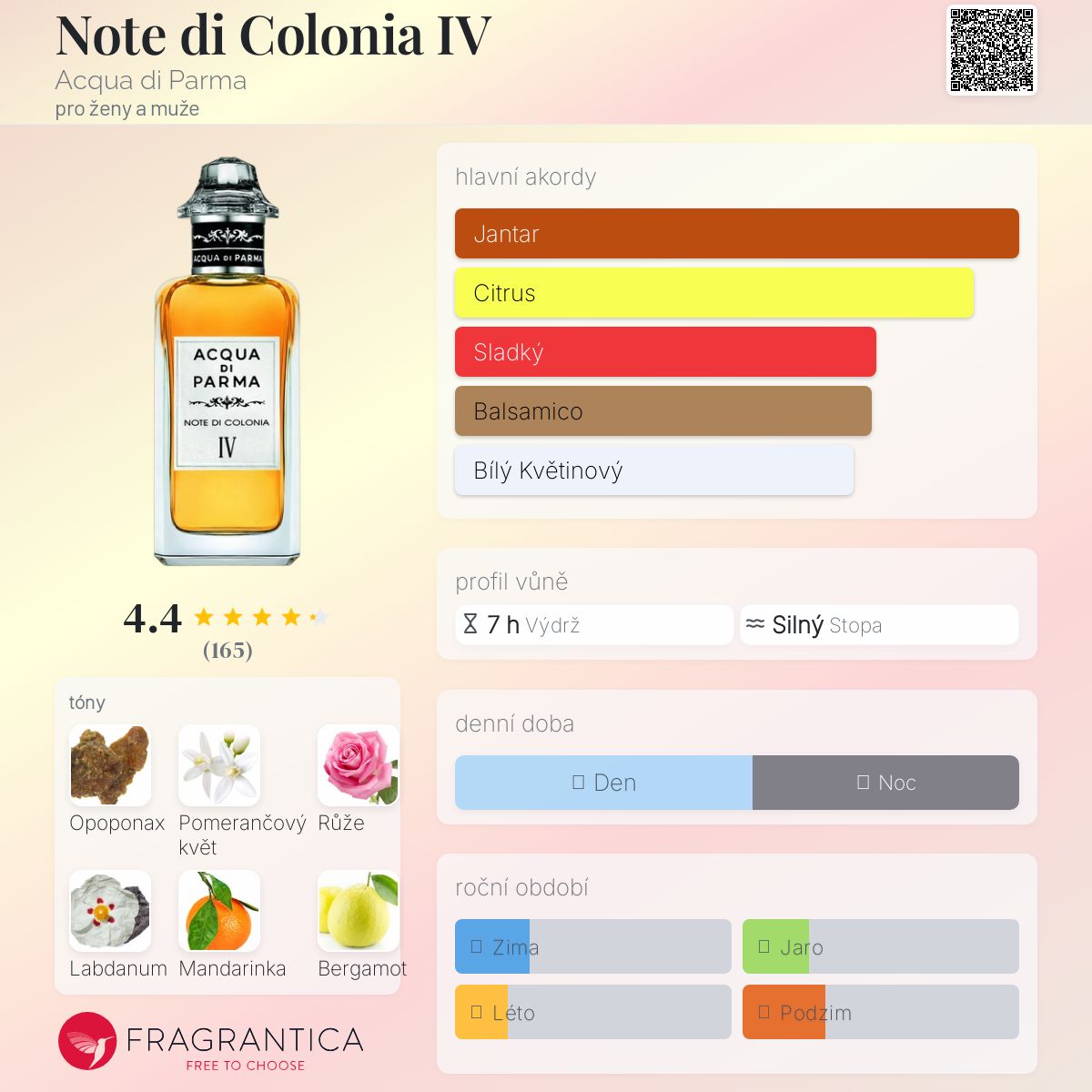 Note di Colonia IV podle Acqua di Parma je Orientální Floral vůně pro ženy a muže. Note di Colonia IV byl/a uveden/a v roce 2017. Vrchní tóny jsou Mandarinka a Bergamot; střední tóny jsouPomerančový květ a Turecká růže ; základní tóny jsou Opoponax, Labdanum a Pačuli.