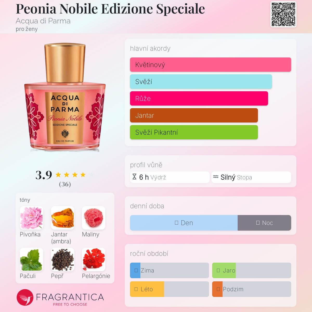 Peonia Nobile Edizione Speciale podle Acqua di Parma je Chypre Floral vůně pro ženy. Peonia Nobile Edizione Speciale byl/a uveden/a v roce 2017. Vrchní tóny jsou Maliny a Černý pepř; střední tóny jsouPivoňka a Pelargónie ; základní tóny jsou Jantar (ambra) a Pačuli.