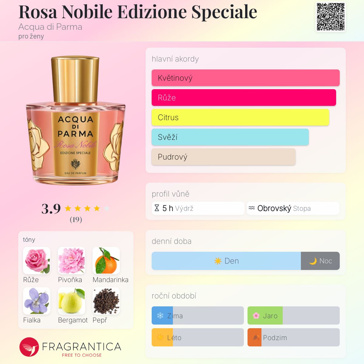 Rosa Nobile Edizione Speciale podle Acqua di Parma je Floral vůně pro ženy. Rosa Nobile Edizione Speciale byl/a uveden/a v roce 2015. Vrchní tóny jsou Mandarinka, Bergamot a Pepř; střední tóny jsouRůže, Pivoňka, Fialka a Konvalinka ; základní tóny jsou Cedr, Ambra a Pižmo.
