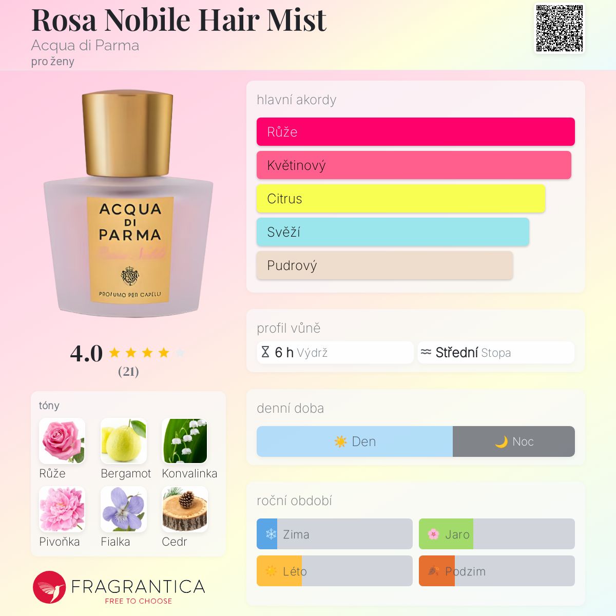Rosa Nobile Hair Mist podle Acqua di Parma je Floral vůně pro ženy. Rosa Nobile Hair Mist byl/a uveden/a v roce 2019. Vrchní tóny jsou Bergamot, Pepř a Pomeranč; střední tóny jsouRůže, Konvalinka, Pivoňka a Fialka ; základní tóny jsou Cedr, Pižmo a Ambra.