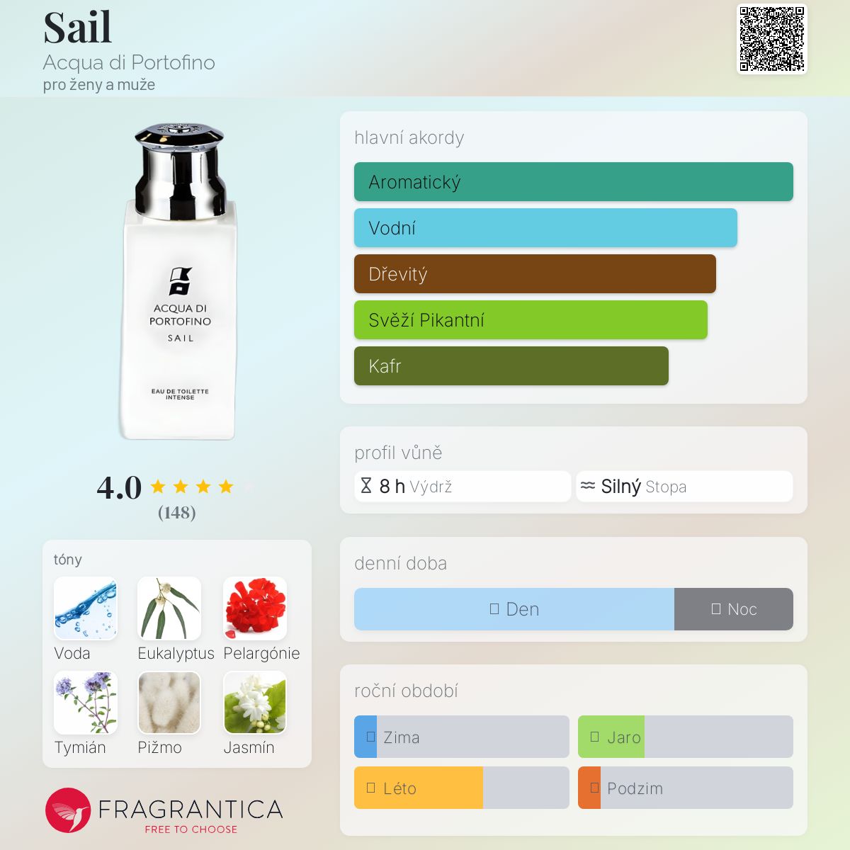 Sail podle Acqua di Portofino je Aromatic Spicy vůně pro ženy a muže. Sail byl/a uveden/a v roce 2012. "Nosem" za touto vůní je Maurizio Cerizza. Vrchní tóny jsou Vodnaté tóny a Eukalyptus; střední tóny jsouPelargónie, Tymián a Jasmín ; základní tóny jsou Bílé pižmo a Pačuli.