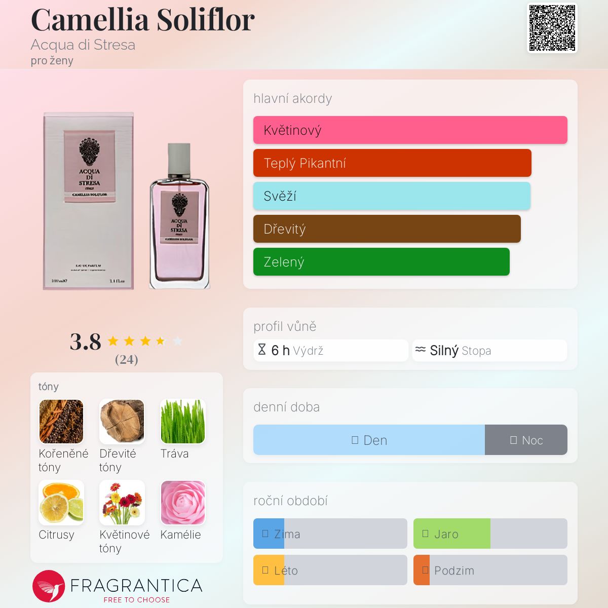 Camellia Soliflor podle Acqua di Stresa je Floral vůně pro ženy. Vrchní tóny jsou Tráva a Citrusy; střední tóny jsouKvětinové tóny a Kamélie ; základní tóny jsou Kořeněné tóny a Dřevité tóny.