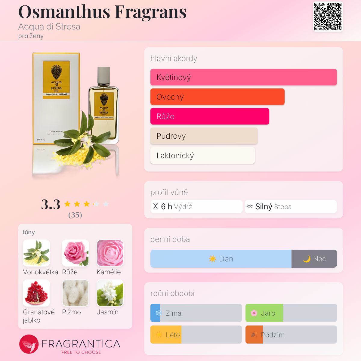 Osmanthus Fragrans podle Acqua di Stresa je Floral Fruity vůně pro ženy. Vrchní tóny jsou Vonokvětka a Granátové jablko; střední tóny jsouRůže, Kamélie, Jasmín a Hyacint ; základní tóny jsou Pižmo a Jantar (ambra).