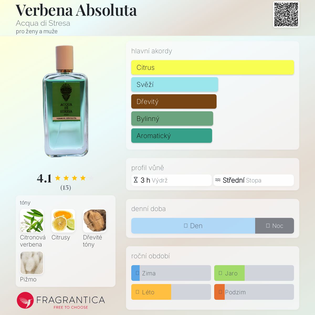 Verbena Absoluta podle Acqua di Stresa je Citrus Aromatic vůně pro ženy a muže. Verbena Absoluta byl/a uveden/a v roce 2013. Vrchní tón je Citrusy ; střední tón jeSporýš ; základní tóny jsou Dřevité tóny a Pižmo.