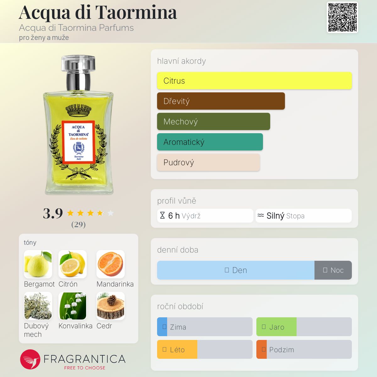 Acqua di Taormina podle Acqua di Taormina Parfums je Citrus vůně pro ženy a muže. Vrchní tóny jsou Bergamot, Citrón a Mandarinka; střední tón jeKonvalinka ; základní tóny jsou Dubový mech, Cedr, Pižmo, Santalové dřevo a Jantar (ambra).