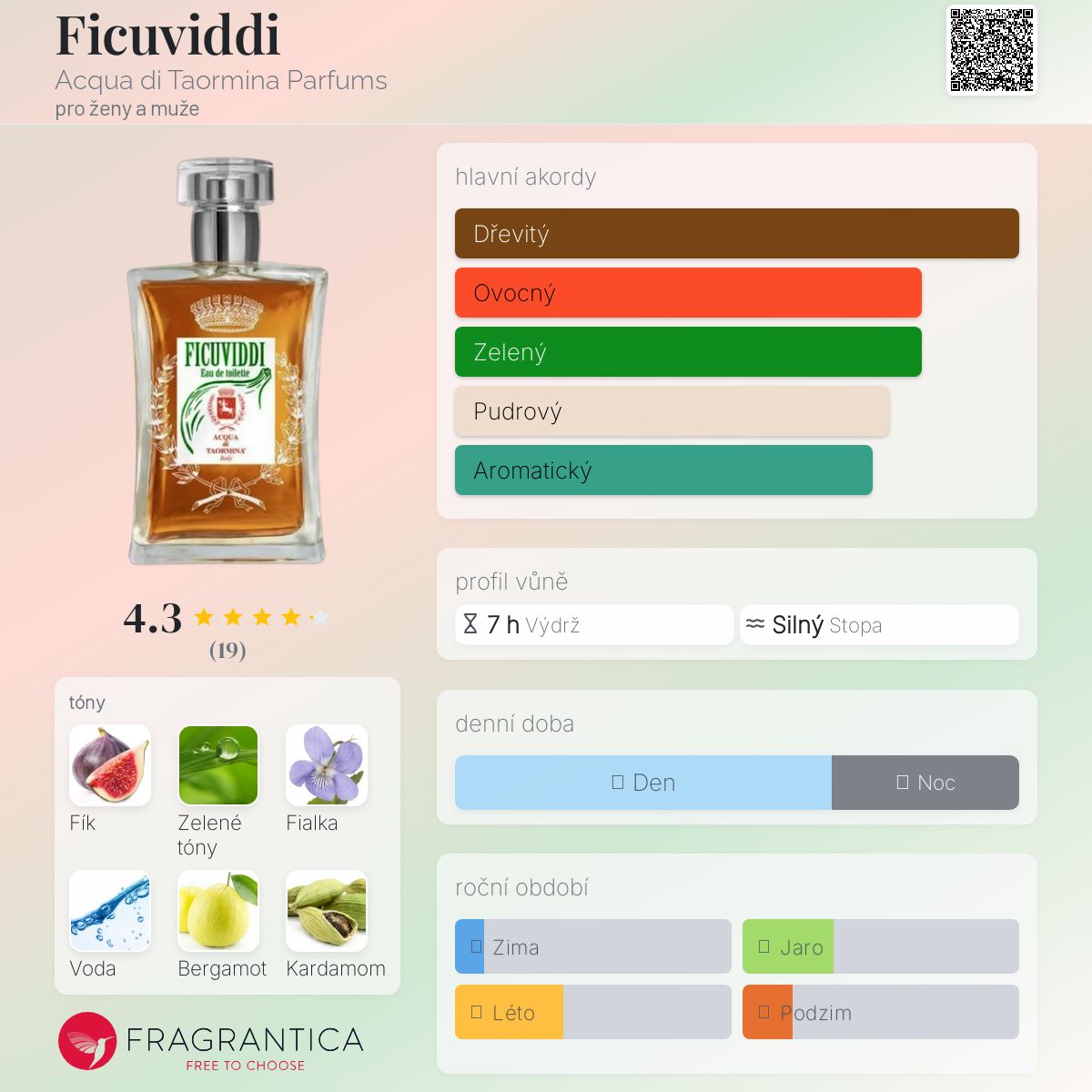 Ficuviddi podle Acqua di Taormina Parfums je vůně pro ženy a muže. Vrchní tóny jsou Bergamot, Kardamom, Cypřiš a Grapefruit; střední tóny jsouFík a Zelené listí ; základní tóny jsou Fialka, Vodní tóny, Cedr a Pižmo.
