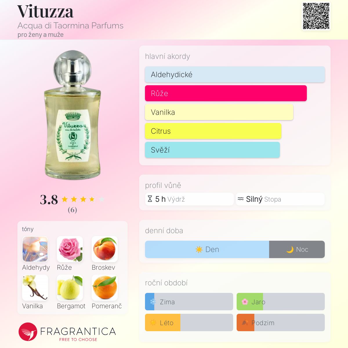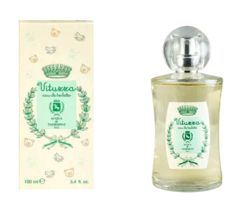 Vituzza podle Acqua di Taormina Parfums je Citrus vůně pro ženy a muže. Vrchní tóny jsou Bergamot a Pomeranč; střední tóny jsouAldehydy, Růže a Broskev ; základní tón je Vanilka.