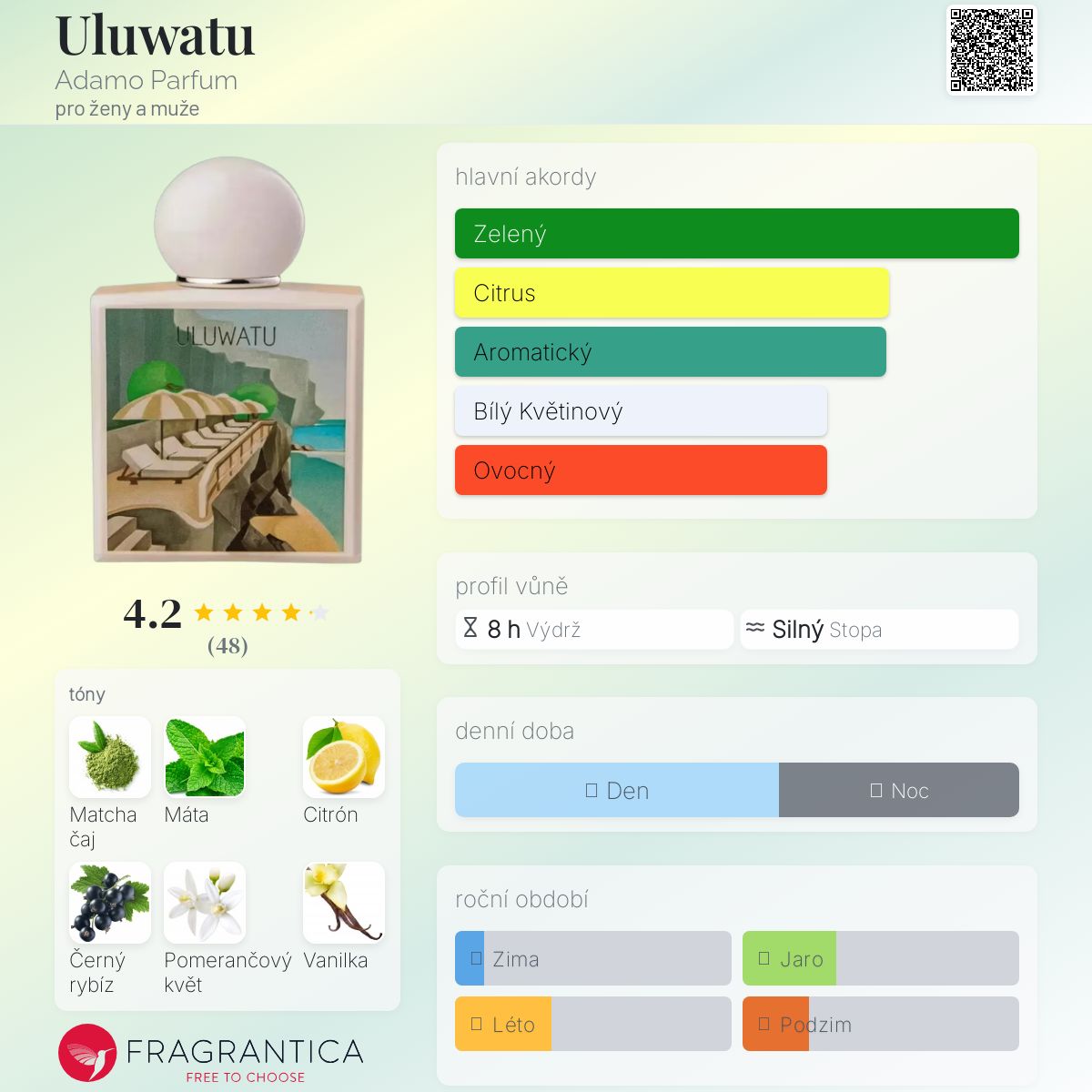 Uluwatu podle Adamo Parfum je Chypre Floral vůně pro ženy a muže. Toto je nová vůně. Uluwatu byl/a uveden/a v roce 2025. "Nosem" za touto vůní je Ilias Ermenidis. Vrchní tóny jsou Matcha čaj, Citrón a Černý rybíz; střední tóny jsouMáta, Pomerančový květ a Konvalinka ; základní tóny jsou Vanilka, Pačuli a Jantar (ambra).