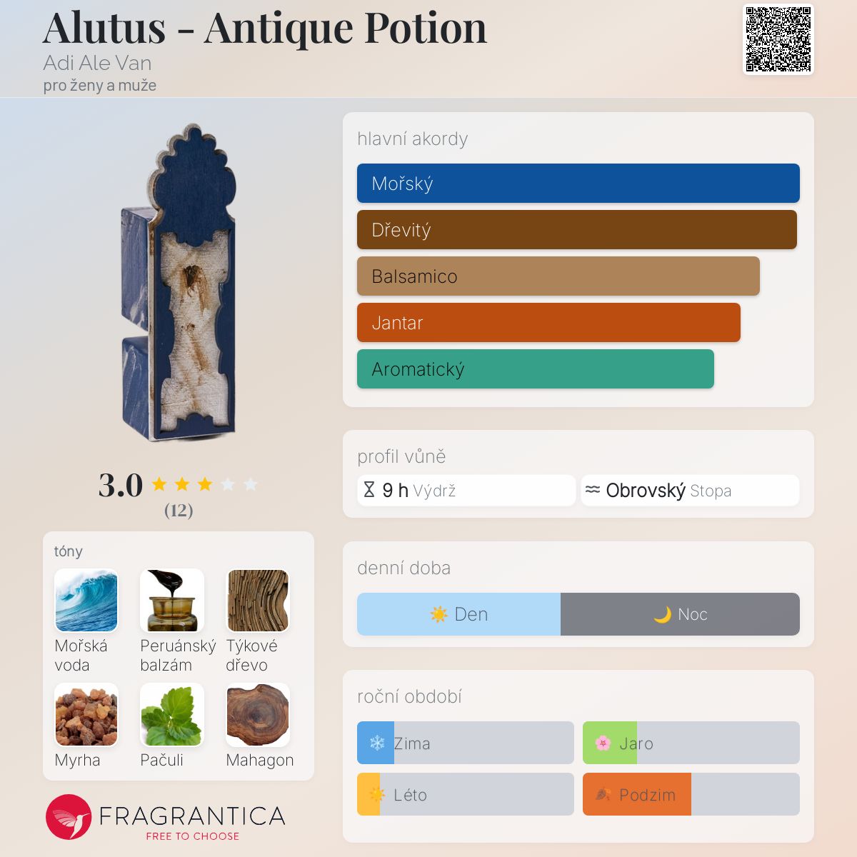 Alutus - Antique Potion podle Adi Ale Van je vůně pro ženy a muže. Toto je nová vůně. Alutus - Antique Potion byl/a uveden/a v roce 2024. "Nosem" za touto vůní je Jimmy Bodin. Vrchní tóny jsou Vodní tóny, Týkové dřevo a Mahagon; střední tóny jsouPeruánský balzám a Myrha ; základní tóny jsou List indonéského pačuli a Agarové dřevo (oud).