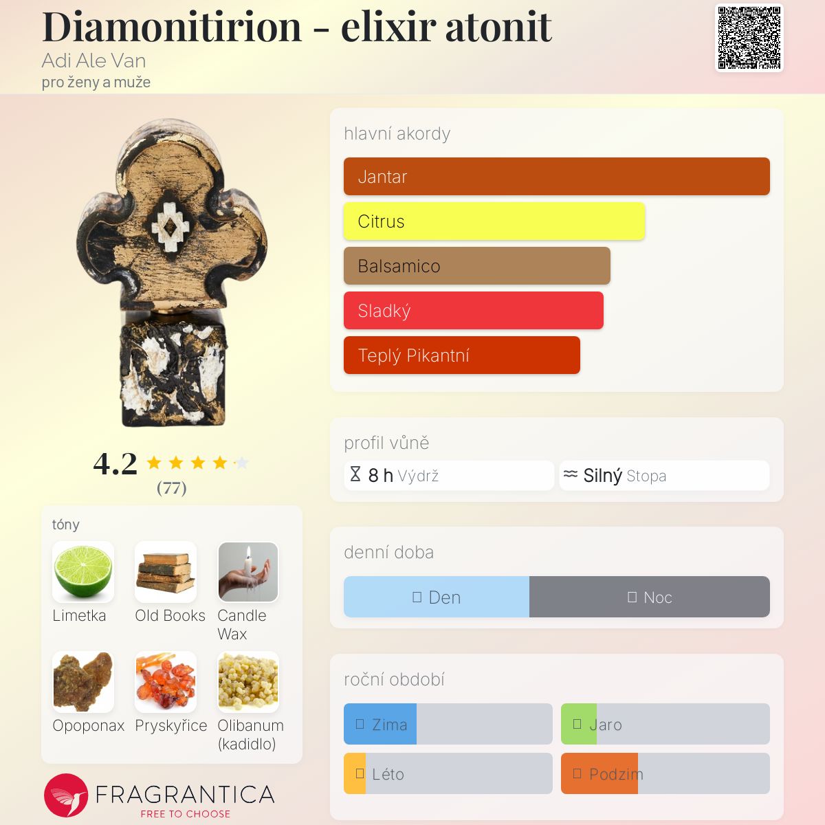 Diamonitirion - elixir atonit podle Adi Ale Van je vůně pro ženy a muže. Toto je nová vůně. Diamonitirion - elixir atonit byl/a uveden/a v roce 2024. "Nosem" za touto vůní je Giovanni Festa. Vrchní tóny jsou Limetka, Růžový pepř a Kardamom; střední tóny jsouStaré knihy, Svíčkový vosk, Opoponax, Olibanum a Myrha ; základní tóny jsou Pryskyřice, Jantar (ambra) a Pižmo.