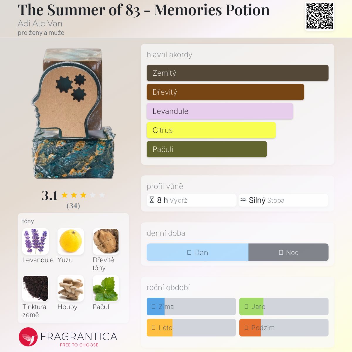 The Summer of 83 - Memories Potion podle Adi Ale Van je vůně pro ženy a muže. The Summer of 83 - Memories Potion byl/a uveden/a v roce 2023. "Nosem" za touto vůní je Jimmy Bodin. Vrchní tóny jsou Yuzu a Houby; střední tóny jsouLevandule, Dřevité tóny a Tabákový list ; základní tóny jsou Půdní tinktura, List indonéského pačuli a Fialkový list.