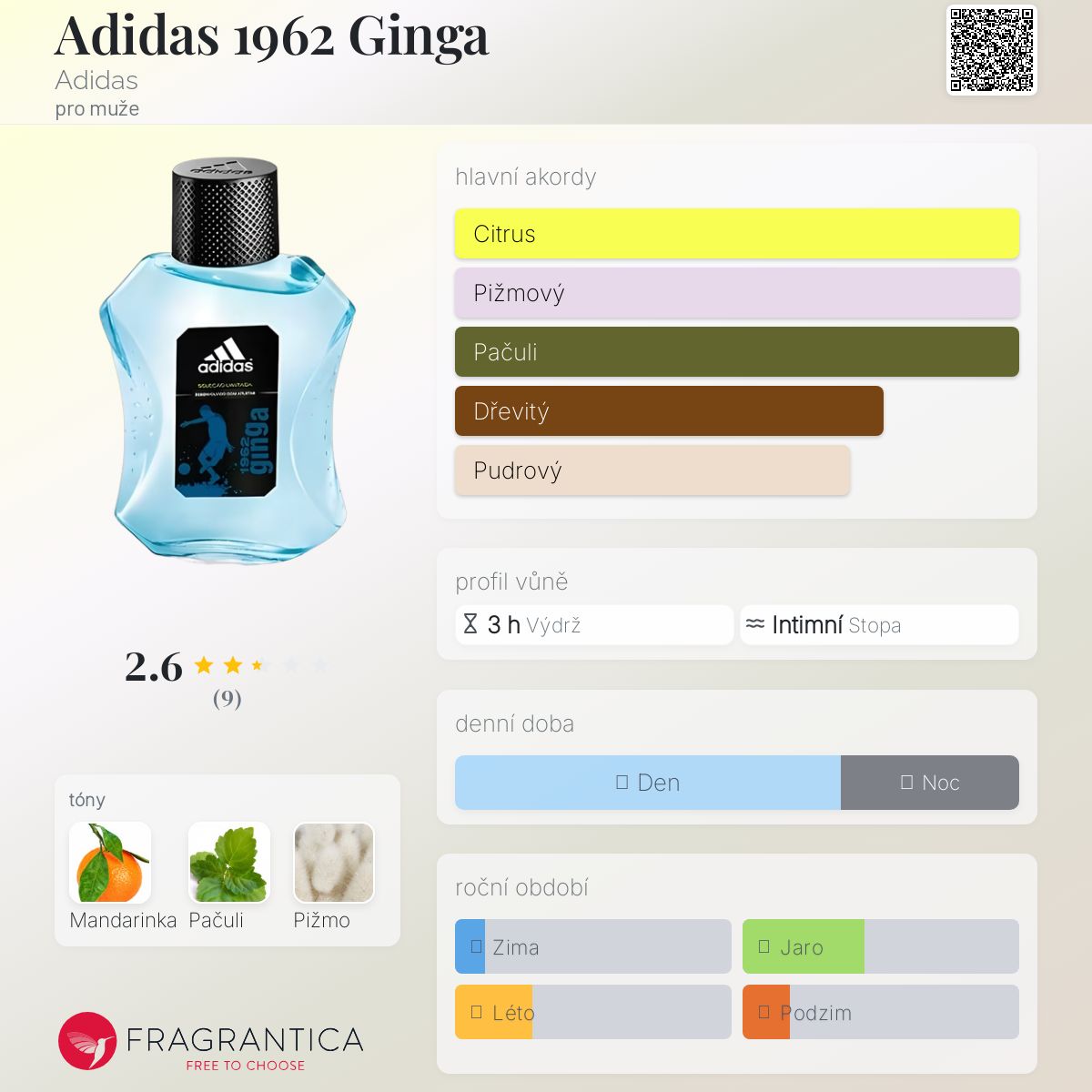 Adidas 1962 Ginga podle Adidas je Aromatic Fougere vůně pro muže. Adidas 1962 Ginga byl/a uveden/a v roce 2013. Vrchní tón je Mandarinka ; střední tón jePačuli ; základní tón je Pižmo.