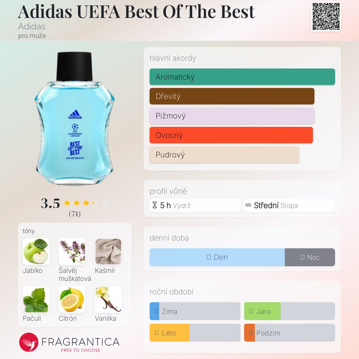 Adidas UEFA Best Of The Best podle Adidas je Aromatic vůně pro muže. Adidas UEFA Best Of The Best byl/a uveden/a v roce 2023. Vrchní tóny jsou Citrón, Levandule a Fialkový list; střední tóny jsouJablko, Šalvěj muškátová a Kašmír ; základní tóny jsou Pačuli, Pižmo a Vanilka.