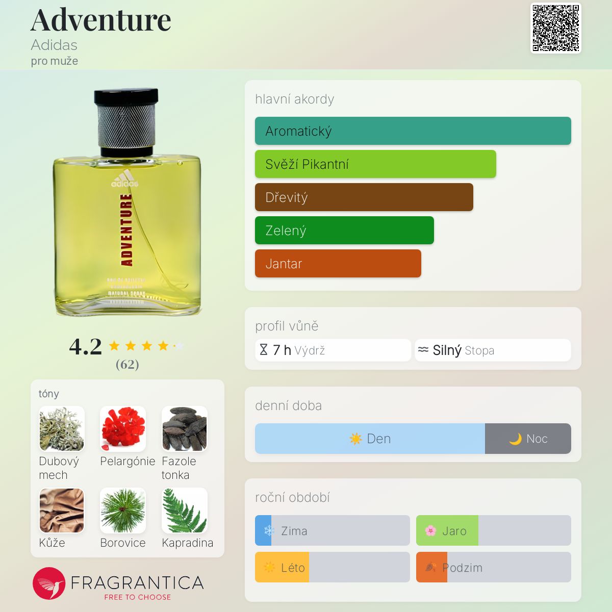 Adventure podle Adidas je Aromatic Fougere vůně pro muže. Adventure byl/a uveden/a v roce 1992. Vrchní tóny jsou Petitgrain, Rozmarýn, Levandule, Koriandr, Zelené tóny, Bazalka a Bergamot; střední tóny jsouPelargónie, Borovice, Kapradina, Šalvěj muškátová, Brambořík a Karafiát ; základní tóny jsou Dubový mech, Fazole tonka, Kůže, Jantar (ambra), Virginský cedr, Jedle a Pižmo.