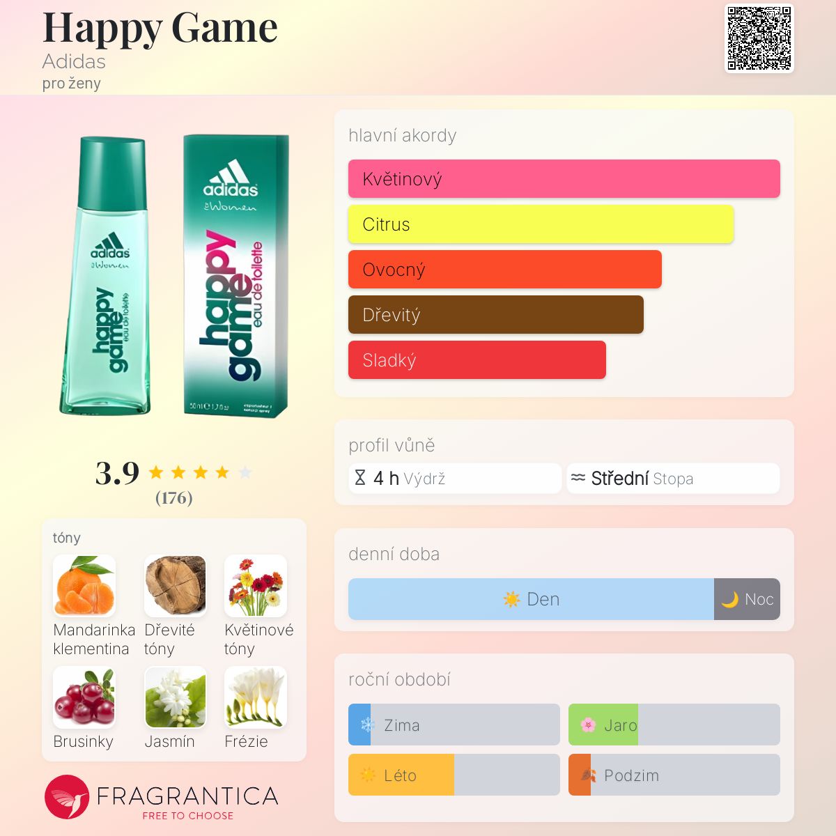 Happy Game podle Adidas je Floral Fruity vůně pro ženy. Happy Game byl/a uveden/a v roce 2011. Vrchní tóny jsou Mandarinka klementina a Brusinky; střední tóny jsouKvětinové tóny, Jasmín a Frézie ; základní tóny jsou Dřevité tóny a Jantar (ambra).