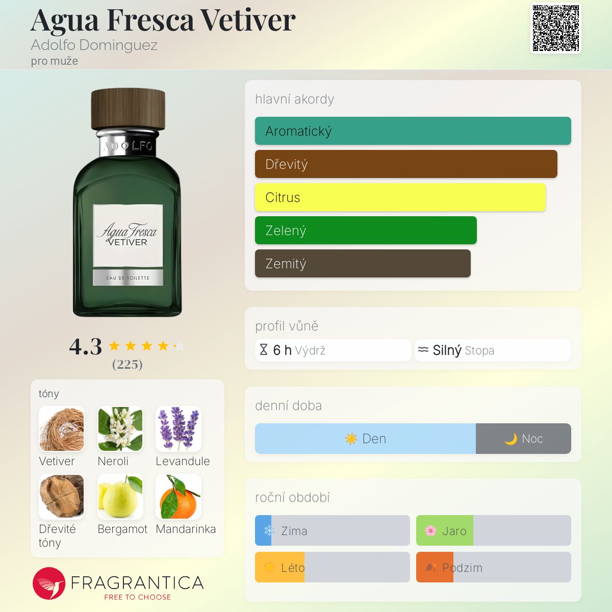 Agua Fresca Vetiver podle Adolfo Dominguez je Aromatic vůně pro muže. Agua Fresca Vetiver byla spuštěna během 2000. "Nosem" za touto vůní je Ramon Monegal.
